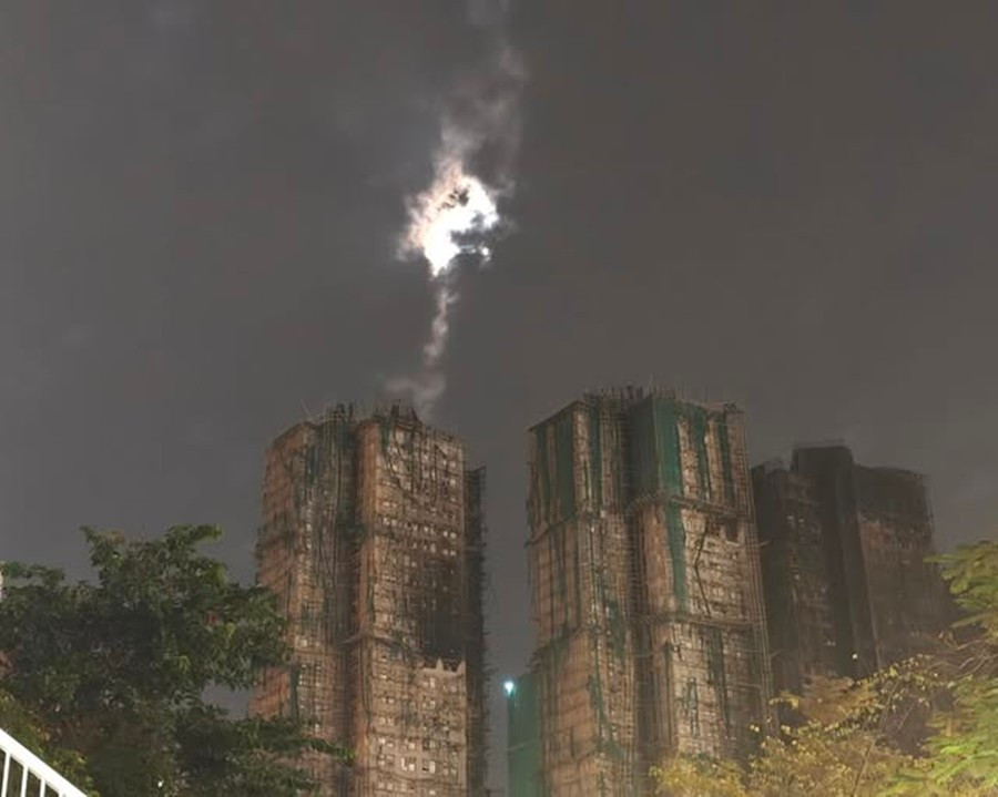 Luồng ánh sáng lạ trên bầu trời Hong Kong, ngay phía trên một trong những tòa chung cư bị cháy. Ảnh: Dimsum Daily.