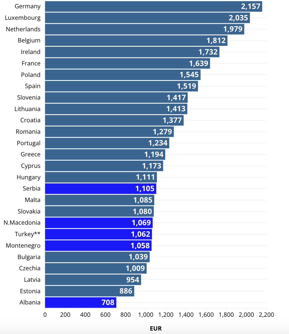 Trong số 29 quốc gia gồm 22 thành viên EU và 7 nước ứng cử viên, mức lương tối thiểu dưới 1.000 euro đang tồn tại ở 15 quốc gia. Tất cả các quốc gia ứng cử viên EU đều nằm trong nhóm thấp nhất này, cùng với một số quốc gia Đông Âu.