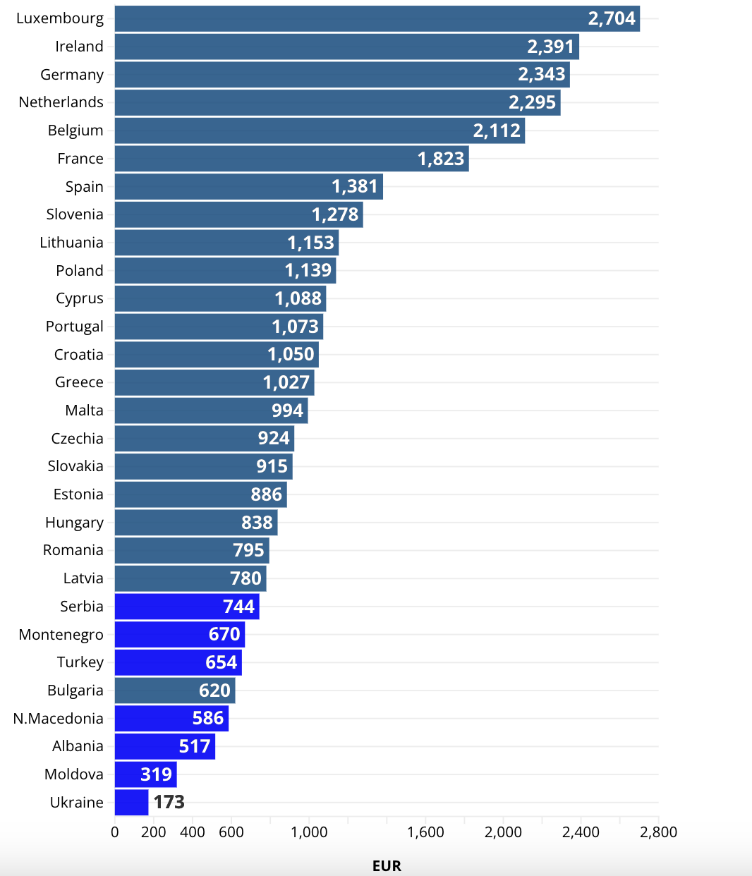 Khi tính cả các quốc gia ứng cử viên gia nhập EU, Ukraine gây chú ý với mức lương tối thiểu chỉ 173 euro, theo sau là Moldova với 319 euro.