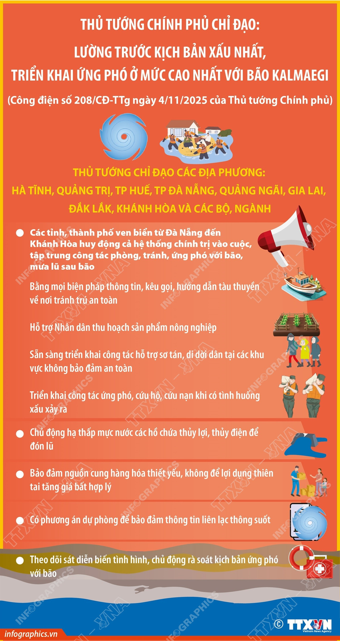 Thủ tướng Chính phủ Phạm Minh Chính vừa ký Công điện số 208/CĐ-TTg ngày 4/11/2025 yêu cầu các bộ ngành, địa phương chủ động phòng, tránh, ứng phó với bão Kalmaegi.