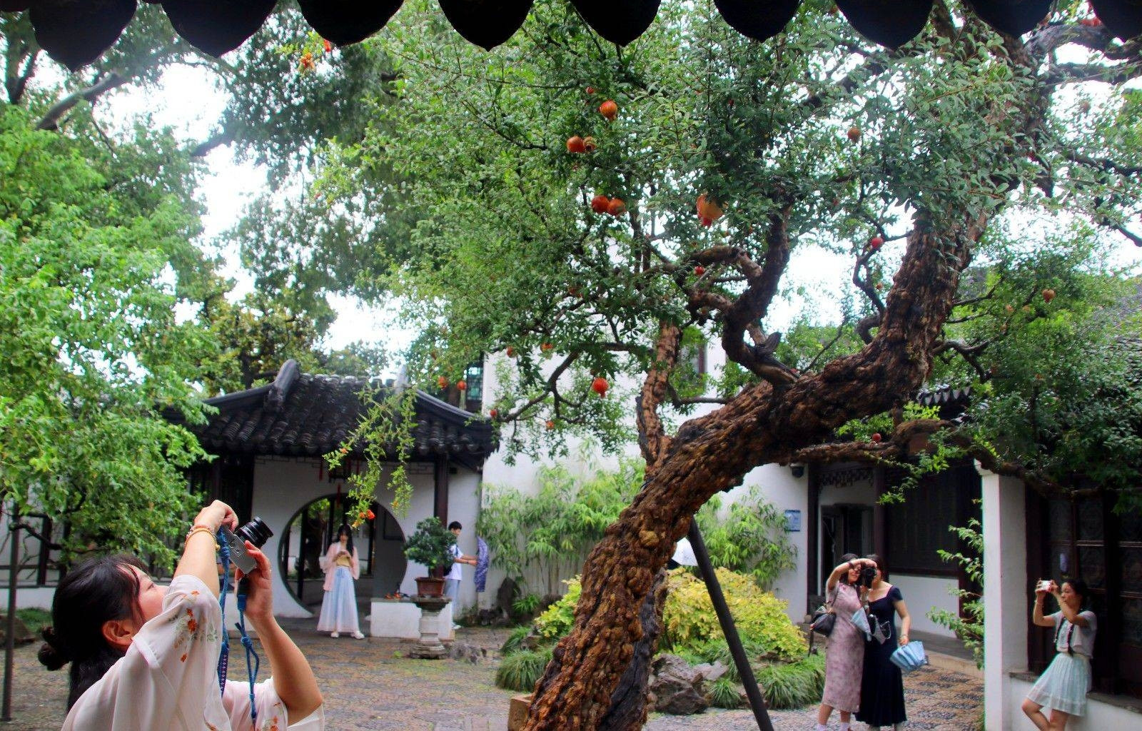 Những ngày này, không khó để bắt gặp cảnh hàng dài du khách tạo dáng chụp ảnh dưới tán lựu, trong ánh nắng thu dịu dàng ở Tô Châu.