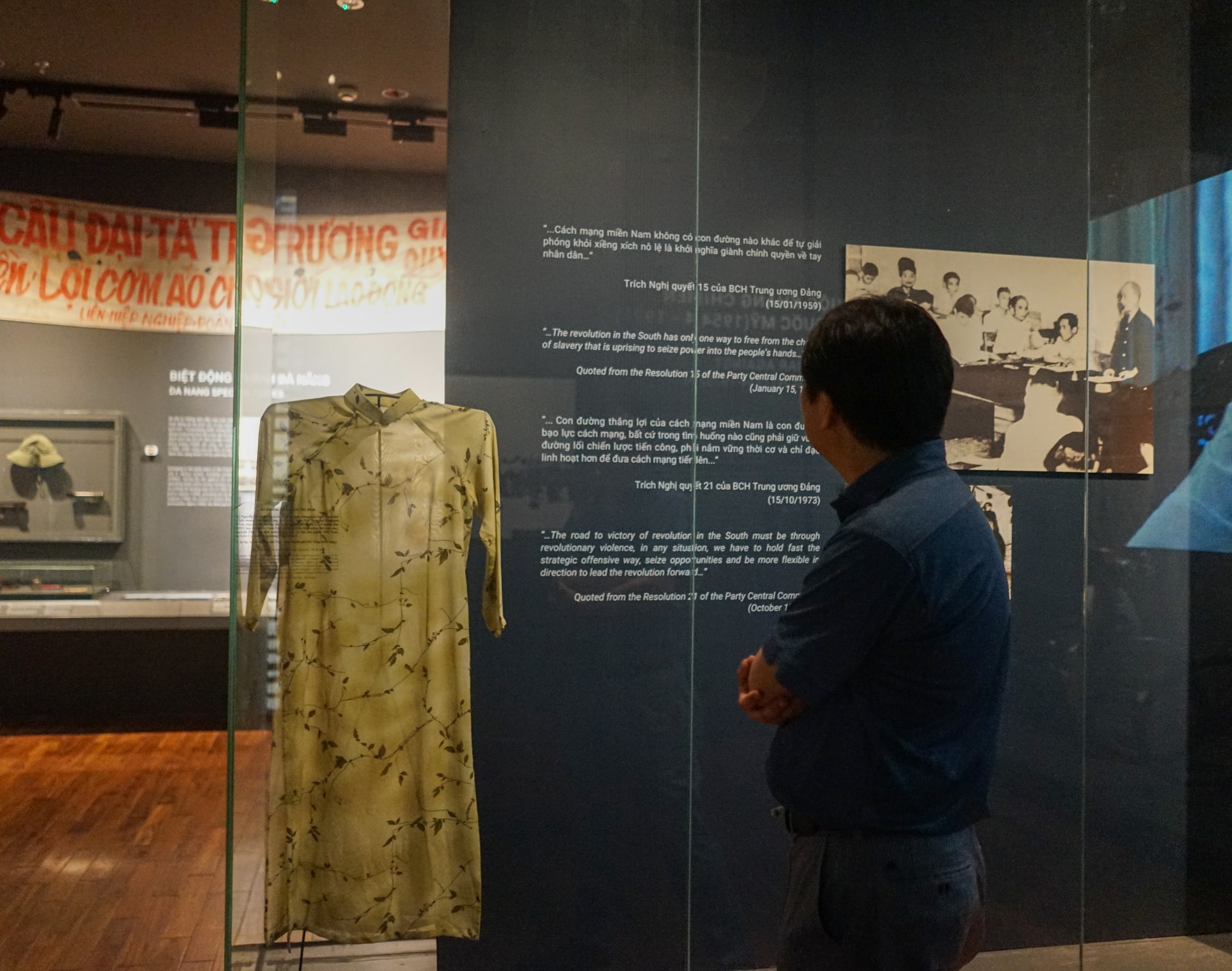 Trong không gian trưng bày mang chủ đề “Đà Nẵng trong cuộc kháng chiến chống đế quốc Mỹ (1954 - 1975)” ở Bảo tàng Đà Nẵng, có một chiếc áo dài đặc biệt, thu hút sự theo dõi của nhiều khách tham quan.