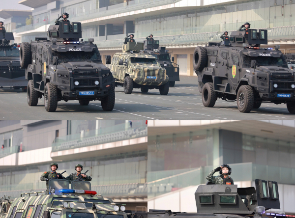 Các phương tiện đặc chủng của lực lượng CAND tại buổi tập luyện ngày 9/1.