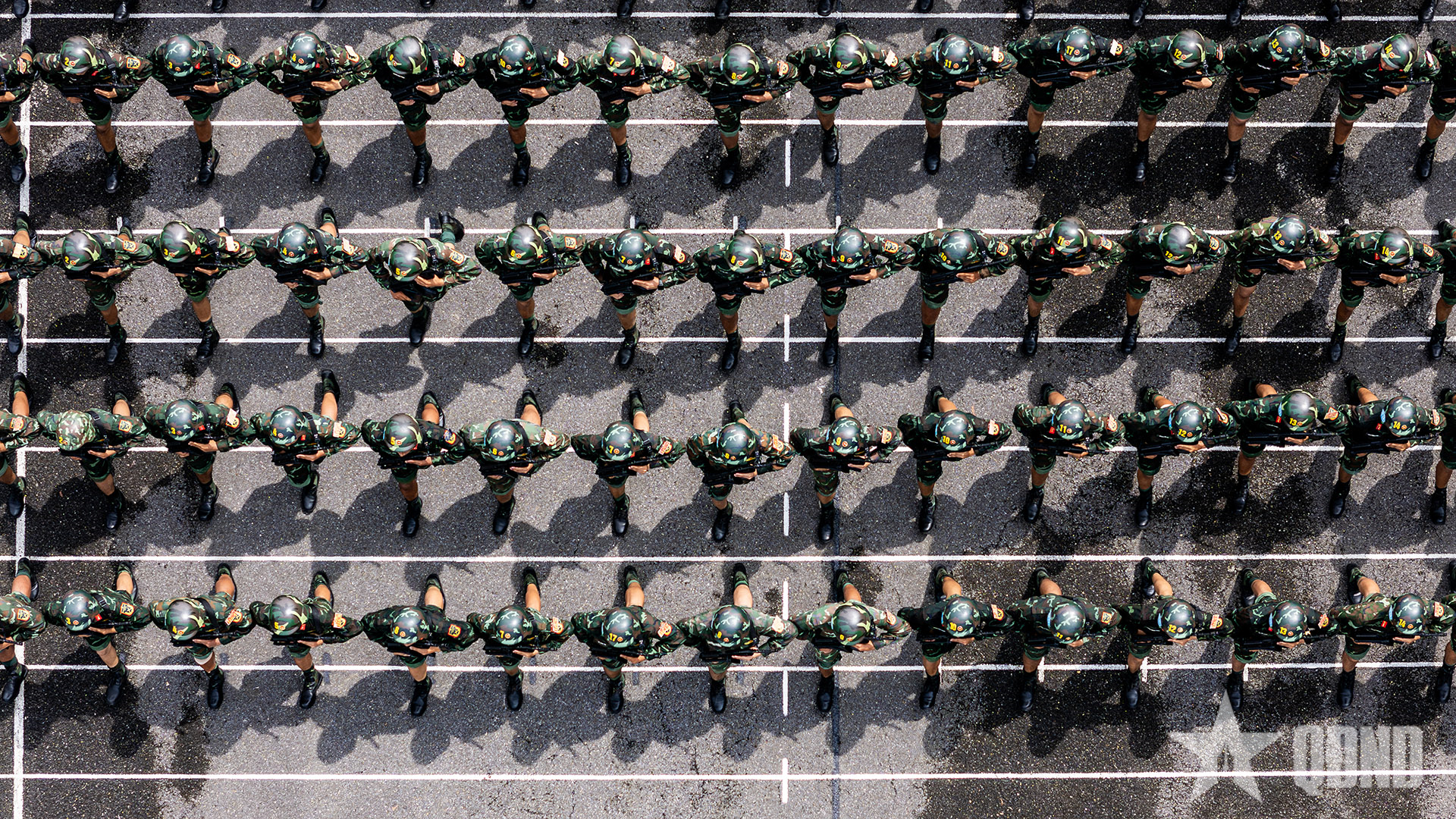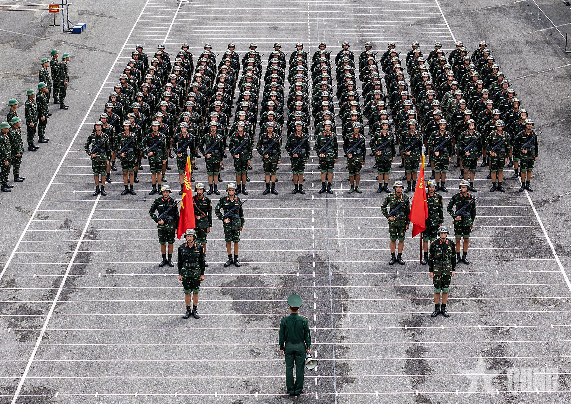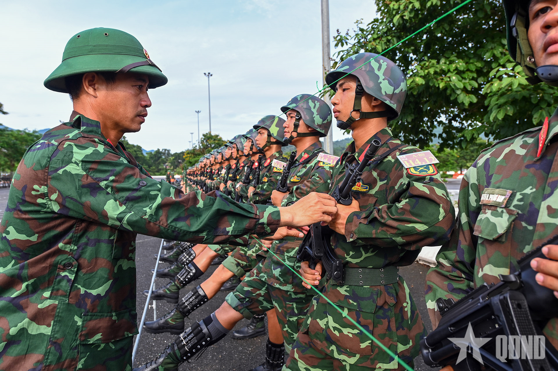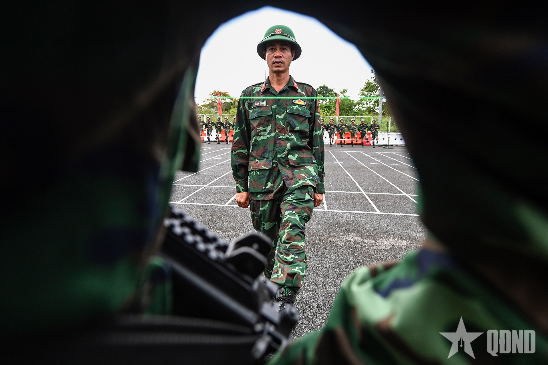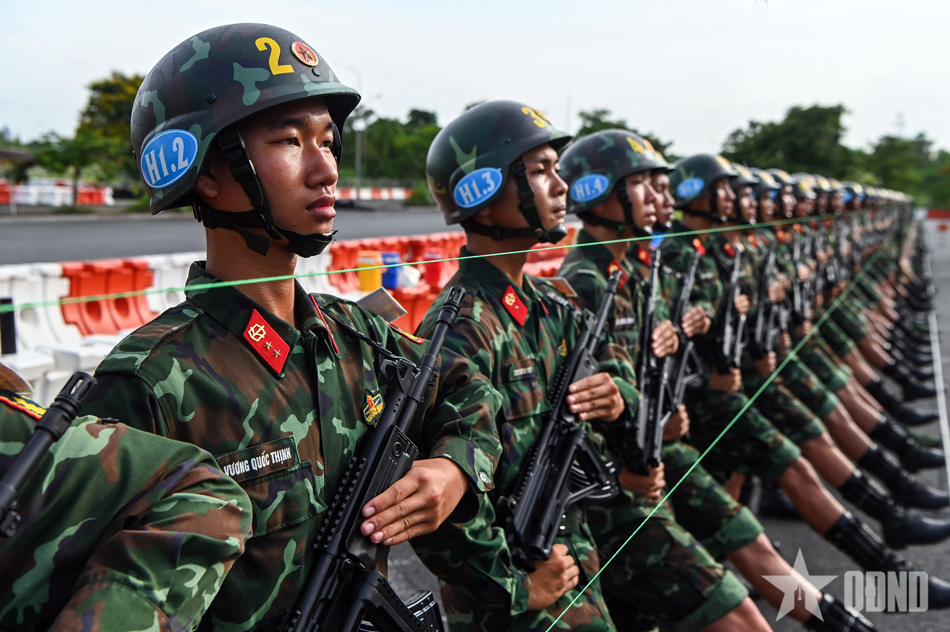 Khối chiến sĩ phòng hóa ôm súng, động tác tập trung vào phần chân, sao cho nhanh, mạnh, đều, đảm bảo tốc độ 106 bước/phút trên nền nhạc hành tiến.