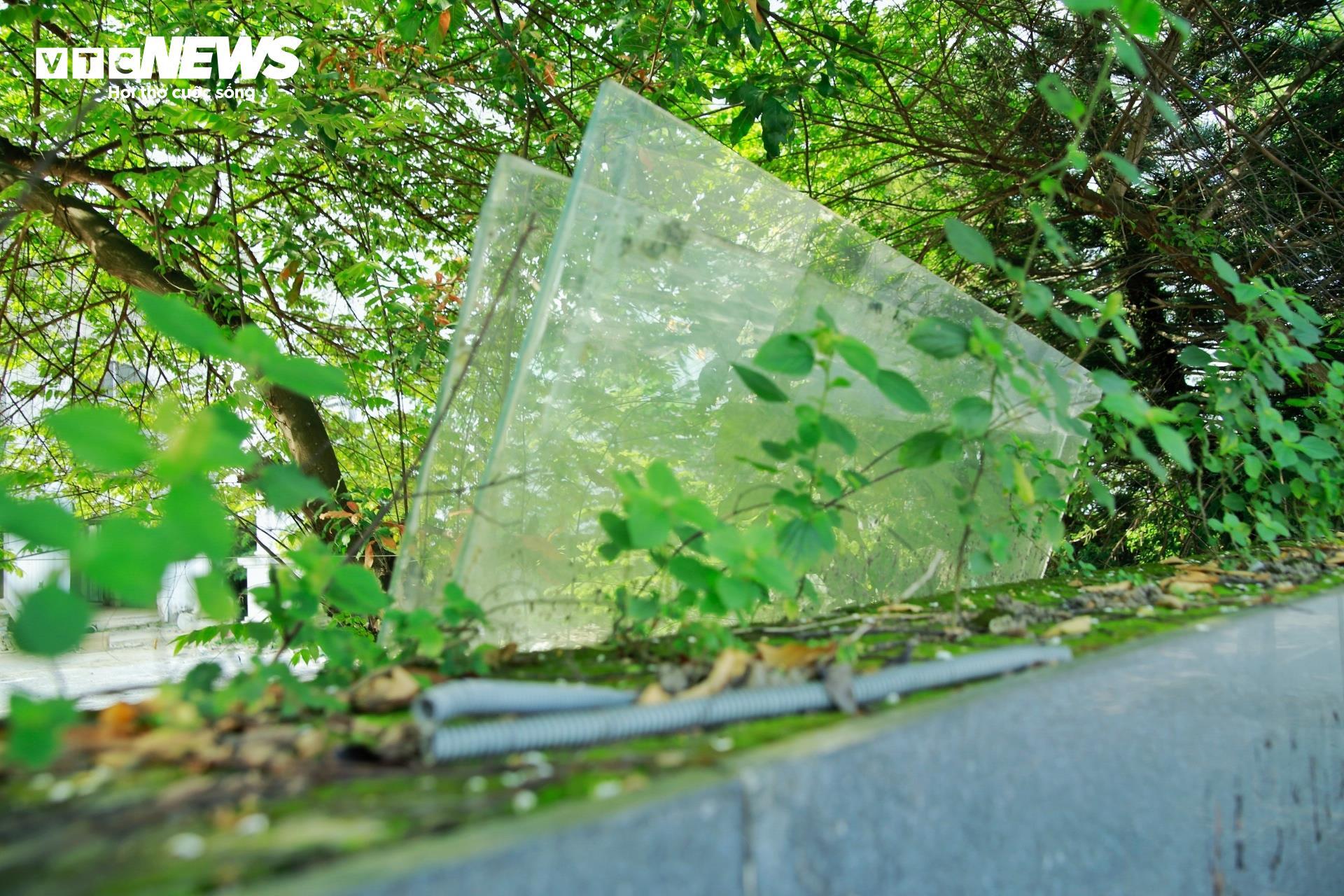 Cỏ dại, kính và ống nhựa nằm ở phần tường bao bên trong dự án .