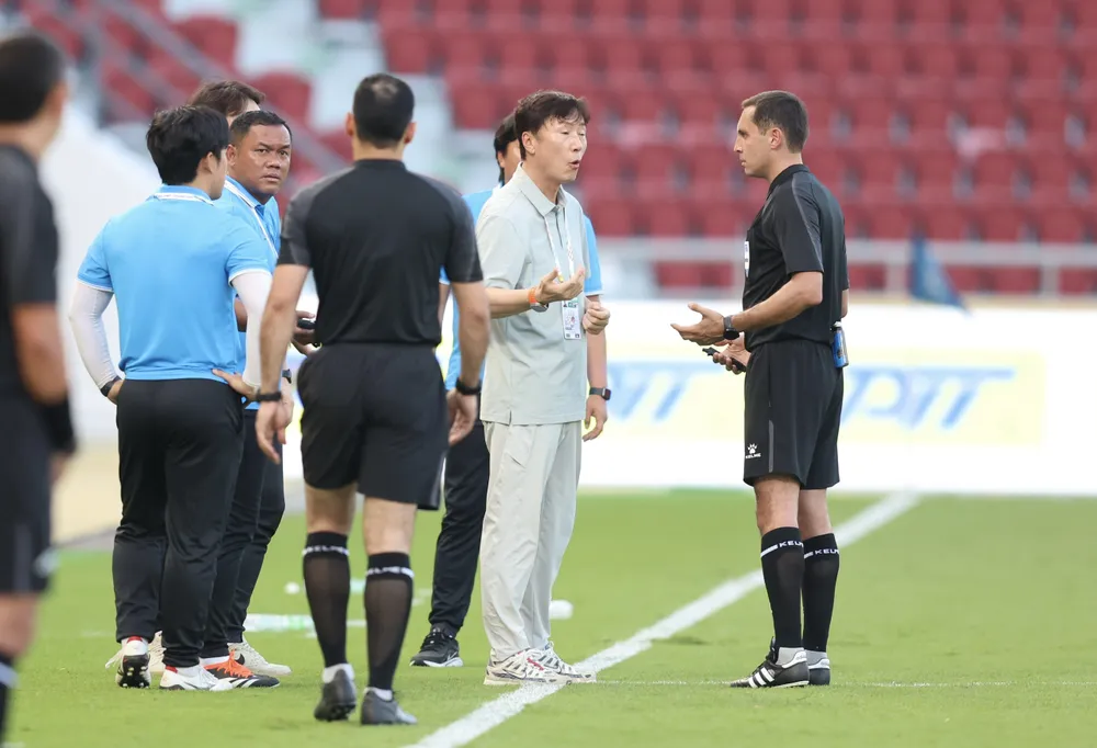 HLV Ha Hyeok Jun phản ứng với tổ trọng tài người Uzbekistan khiến ông bị thẻ vàng. Ảnh: ANH PHƯƠNG.