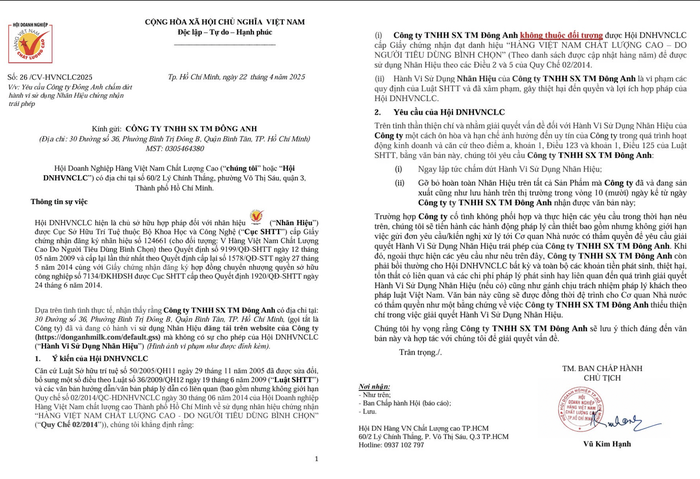 Trước đó, ngày 22/4/2025, Hội Doanh nghiệp Hàng Việt Nam chất lượng cao (DNHVNCLC) đã ra công văn số 26/CV-HVNCLC2025 yêu cầu Công ty TNHH sản xuất Thương mại Đông Anh chấm dứt hành vi sử dụng Nhãn Hiệu chứng nhận trái phép.