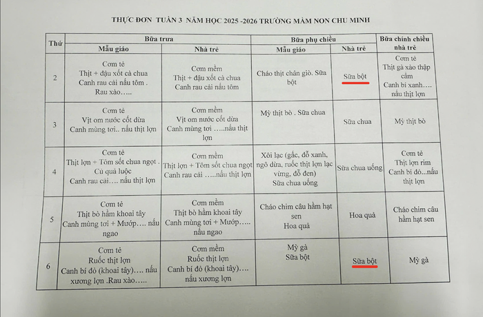 Thực đơn nhà trường ghi 'sữa bột' trong bữa phụ của trẻ.