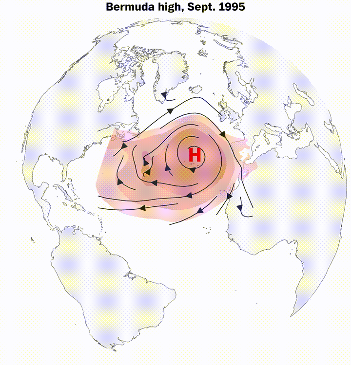 Áp cao Bermuda thông thường sẽ đẩy một cơn bão di chuyển về phía tây trượt lên phía bắc ngay trước khi ảnh hưởng đến Puerto Rico hoặc quần đảo Leeward (thuộc vùng biển Caribe). Khối áp cao này giúp bão không đổ bộ vào đất liền Mỹ khi ép bão cong lên phía bắc.
