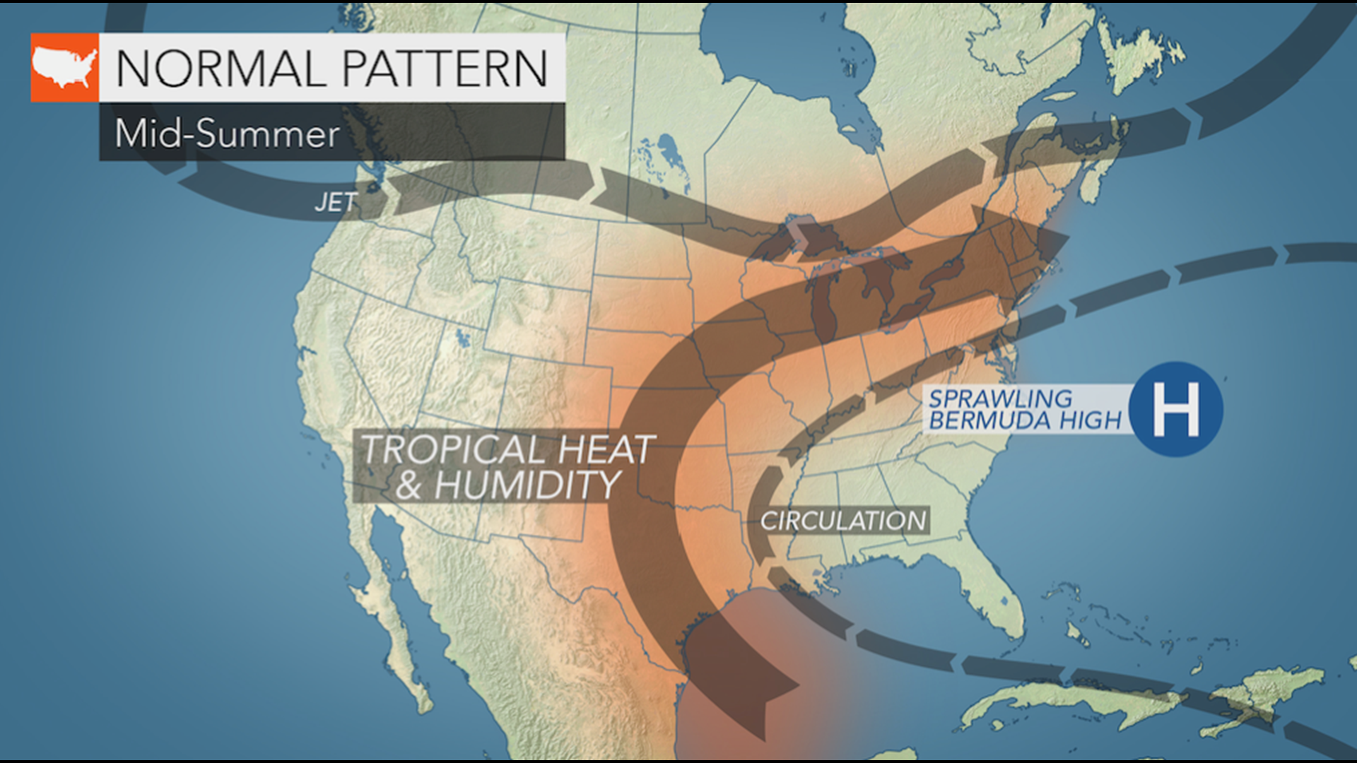 Vào mùa hè, áp cao Bermuda mạnh lên và mở rộng, dịch chuyển về phía tây và neo đậu gần quần đảo Bermuda. Luồng không khí khi đó tràn qua miền Đông nước Mỹ, mang theo hơi ấm và độ ẩm.