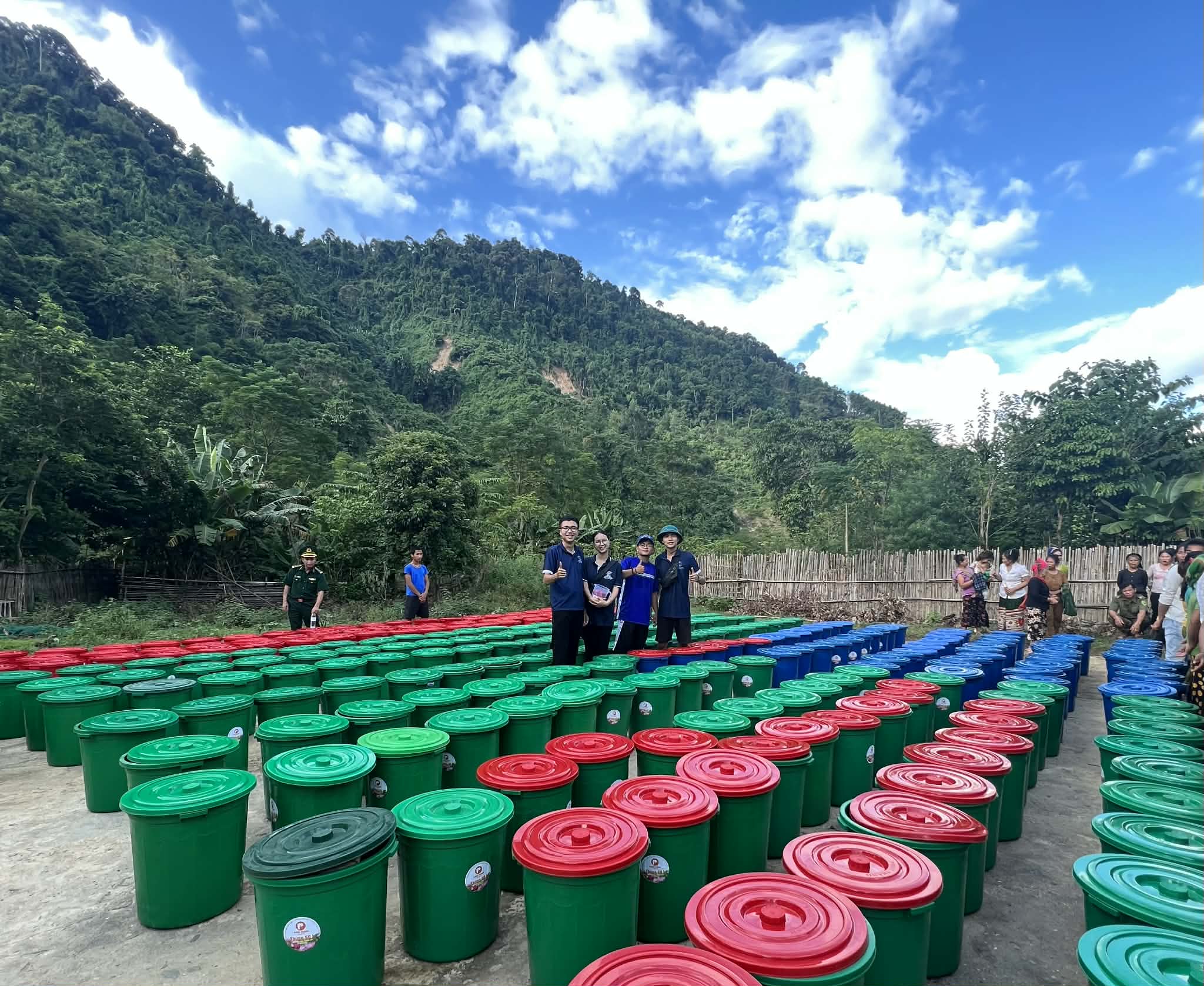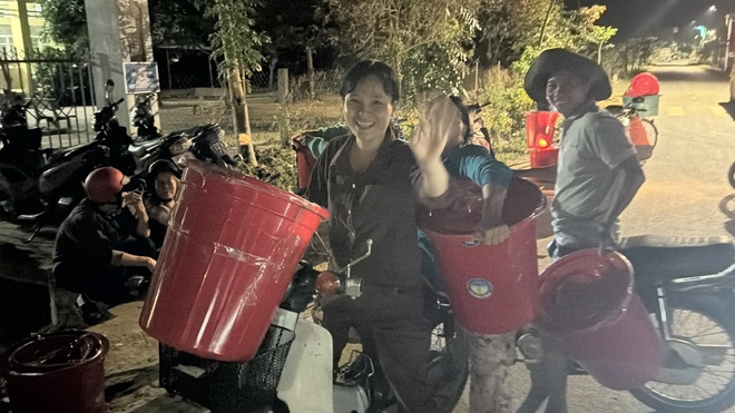 Điều khiến món quà trở nên đặc biệt là cách đóng gói. Thay vì dùng bao tải, hàng trăm phần quà chứa gạo, mì tôm, thuốc men... được xếp gọn gàng trong những chiếc thùng nhựa tròn loại 90 lít, đậy nắp kín.
