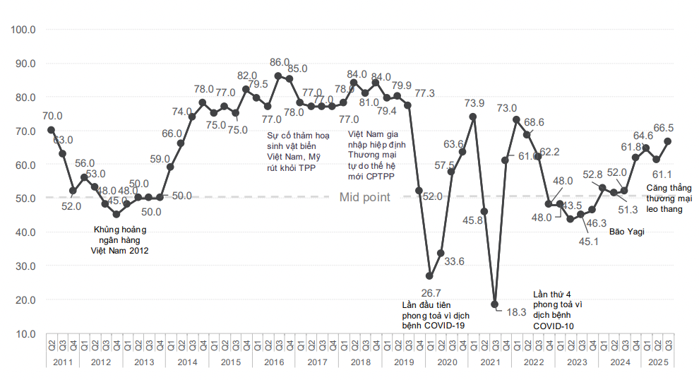 BCI quý III của EuroCham đạt 66,5 điểm - mức cao nhất trong 3 năm qua, phản ánh tinh thần lạc quan của doanh nghiệp châu Âu tại Việt Nam.