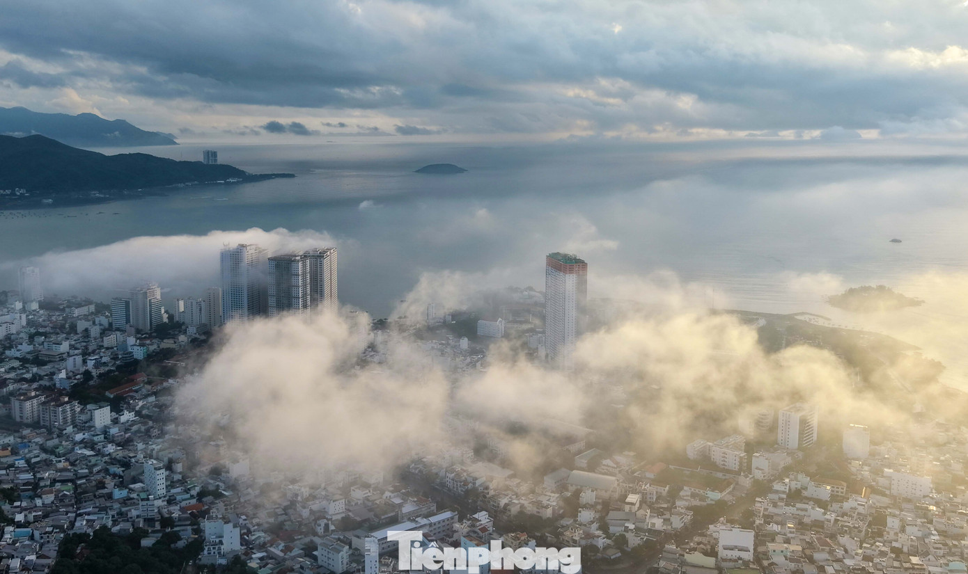 Từ sáng sớm, sương mù giăng kín bầu trời thành phố Nha Trang, những tòa nhà cao tầng dọc bờ biển ẩn hiện trong làn sương trắng xóa, cả thành phố như được khoác lên tấm áo mỏng mang vẻ đẹp kỳ ảo.