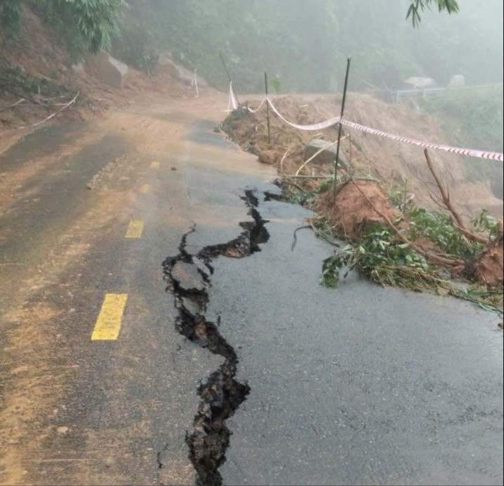 Một đoạn mặt đường dài khoảng 10m trên đèo Gia Bắc bị sụt lún và nứt toác.