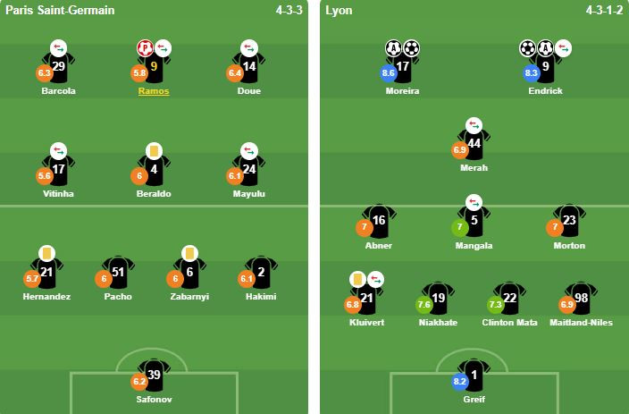 Ghi bàn: PSG: Kvaratskhelia (90+4'); Lyon: Endrick (6'), Moreira (18')