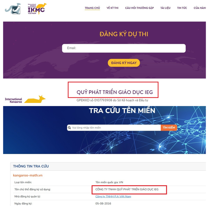 Theo thông tin ghi cuối website thông tin về kỳ thi ghi "Quỹ phát triển giáo dục IEG", theo tìm hiểu tại Hệ thống thông tin tra cứu tên miền, website thông tin về kỳ thi tên chủ thể đăng ký sử dụng là: "Công ty TNHH Quỹ phát triển giáo dục IEG".