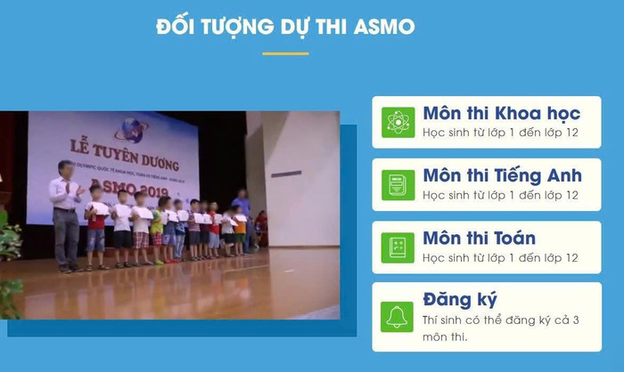 Thông tin trên website quảng bá "kỳ thi olympic quốc tế khoa học, toán và tiếng Anh" giới thiệu: "...Không chỉ tại Malaysia, hàng năm ASMO có hàng trăm ngàn lượt học sinh từ nhiều Quốc gia tham dự và những học sinh xuất sắc nhất sẽ tham dự ASMO Quốc tế được tổ chức luân phiên ở các quốc gia thành viên".