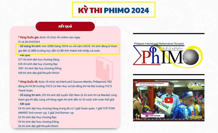 Theo tìm hiểu, ban tổ chức kỳ thi Toán học quốc tế PhIMO tại Việt Nam là Công ty Cổ phần Công nghệ Giáo dục Edufly. Thông tin trên website cuộc thi cho biết, kỳ thi này dành cho học sinh từ mầm non đến học sinh lớp 11. Thí sinh đạt giấy chứng nhận tham gia kỳ thi ngay sau khi đăng ký dự thi.