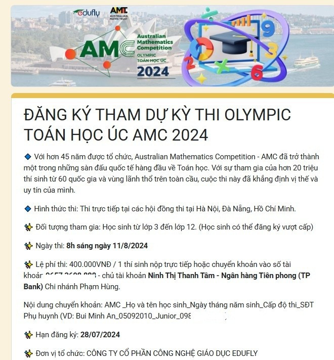 Thông tin trên website kỳ thi Olympic toán học Úc (Australian Mathematics Competition - AMC) giới thiệu, kỳ thi đã thu hút tổng cộng hơn 20 triệu lượt thí sinh từ 60 quốc gia và vùng lãnh thổ trên thế giới tranh tài. Kỳ thi dành cho nhiều lứa tuổi, chia thành 5 cấp độ từ lớp 3-12. (Đặc biệt: thí sinh ở cấp độ thấp hơn có thể đăng kí dự thi ở cấp độ cao hơn). Mỗi thí sinh sẽ nhận được chứng nhận công nhận kết quả bài thi của mình do Quỹ ủy thác Toán học Úc cấp.