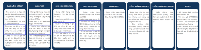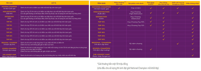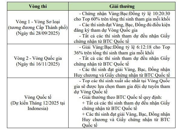 Theo đó, các thí sinh tham gia cuộc thi đều nhận được giấy chứng nhận. Tùy theo từng giải sẽ có thêm phần thưởng tiền mặt, vật phẩm vinh danh, quà tặng từ ban tổ chức, học bổng của nhà tài trợ... Ban tổ chức cũng lưu ý thêm, giải thưởng tiền mặt 10 triệu đồng chia đều cho số lượng thí sinh đạt giải National Champion mỗi khối lớp.