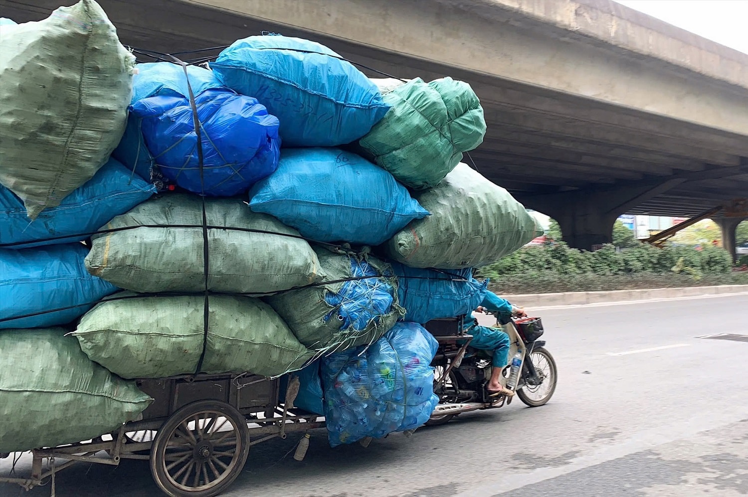 Những chiếc xe chở rác tái chế tiềm ẩn nguy cơ gây mất an toàn giao thông. Ảnh: Xuân Nhi