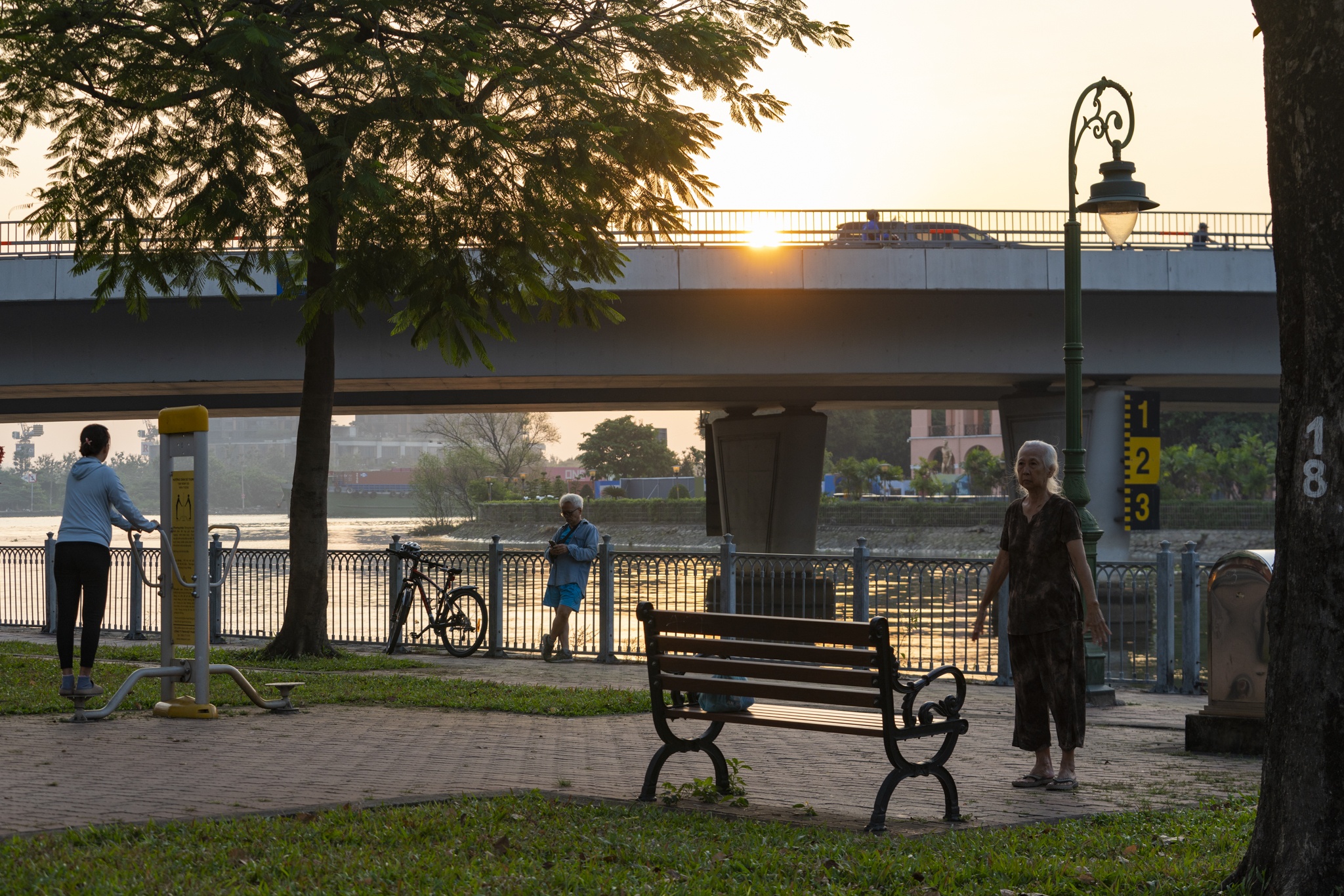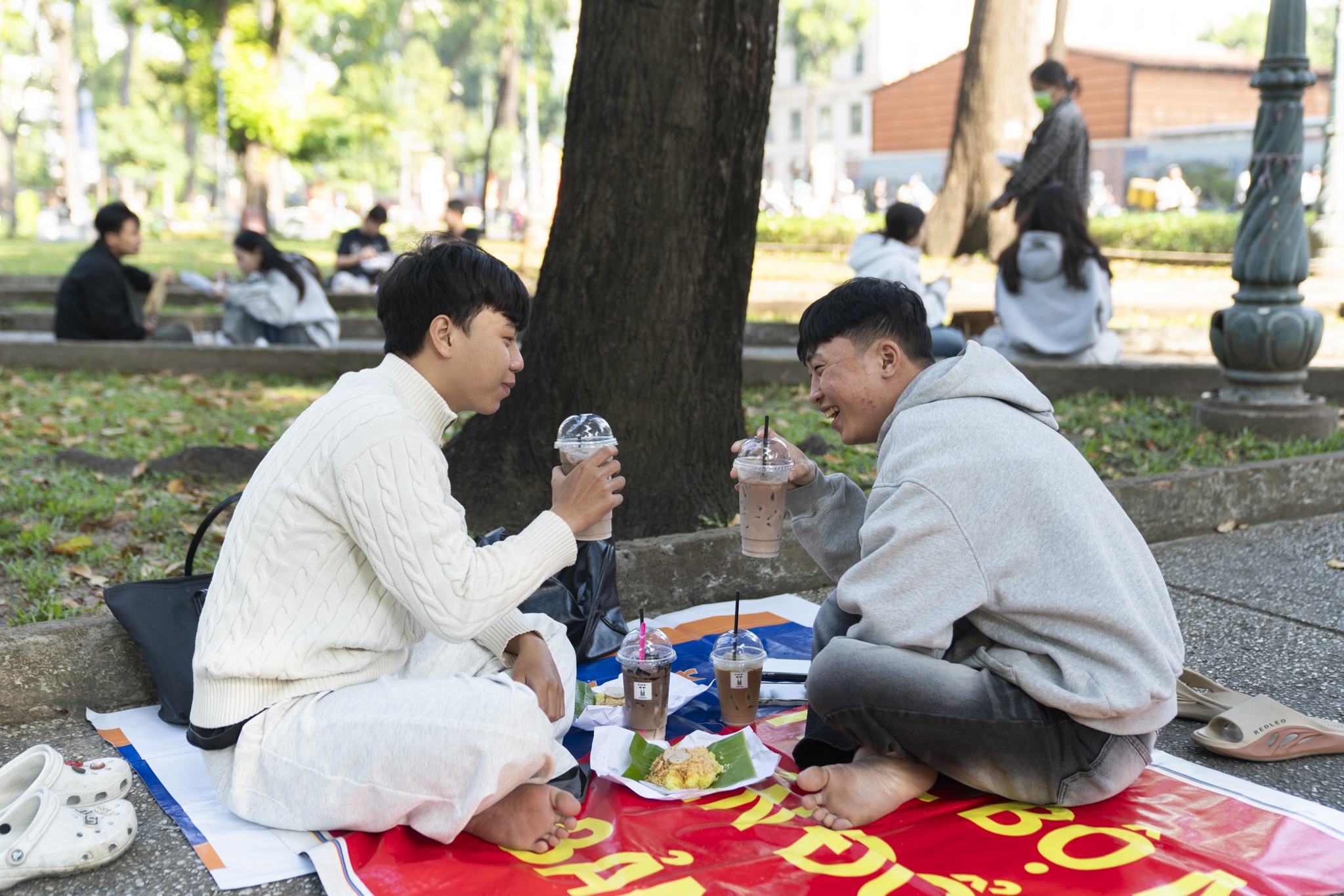 Tại công viên 30/4 (phường Sài Gòn), nhiều bạn trẻ tranh thủ ra đường từ sớm, uống cà phê bệt, đón nắng đầu ngày và tận hưởng cảm giác se lạnh hiếm hoi của thành phố.