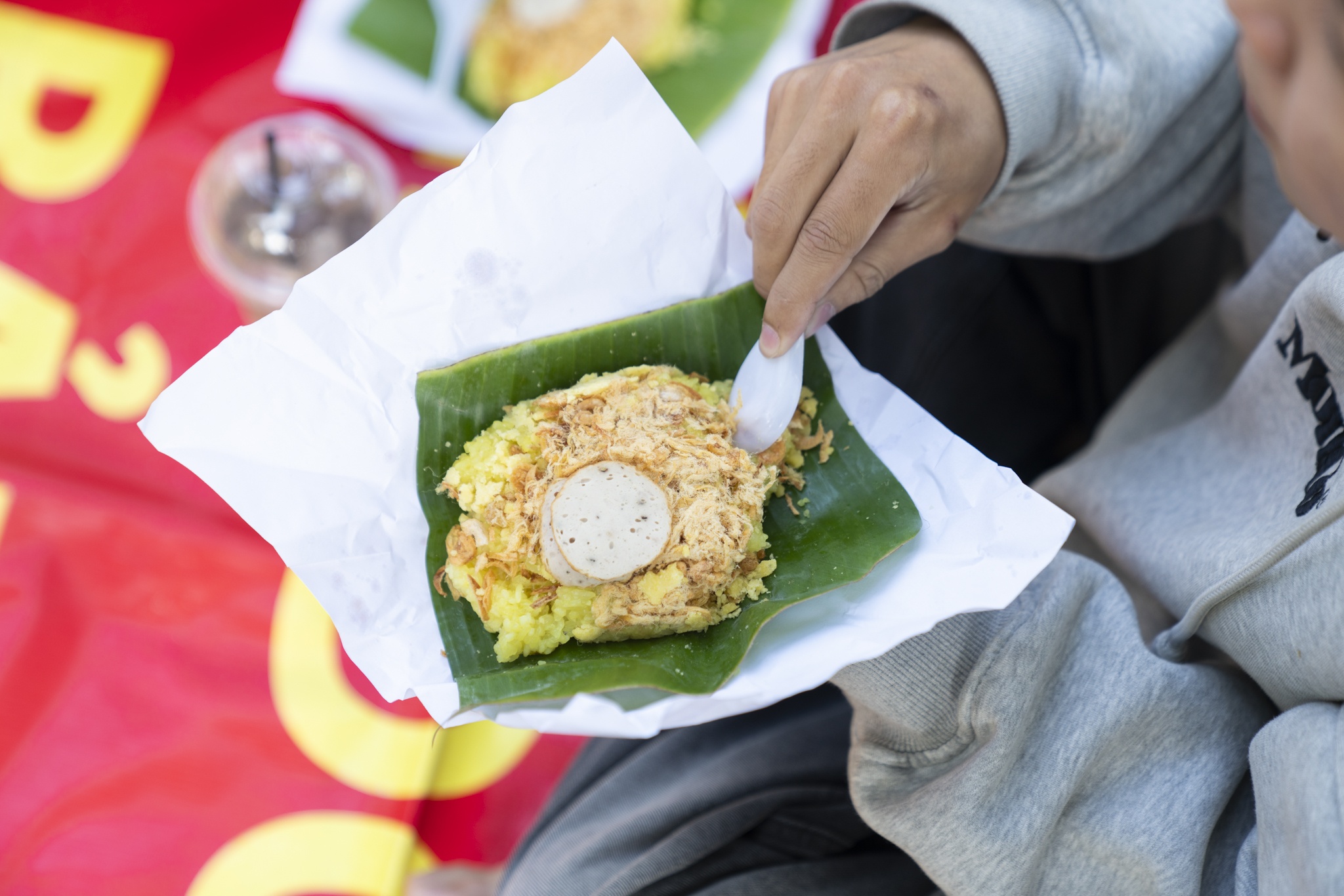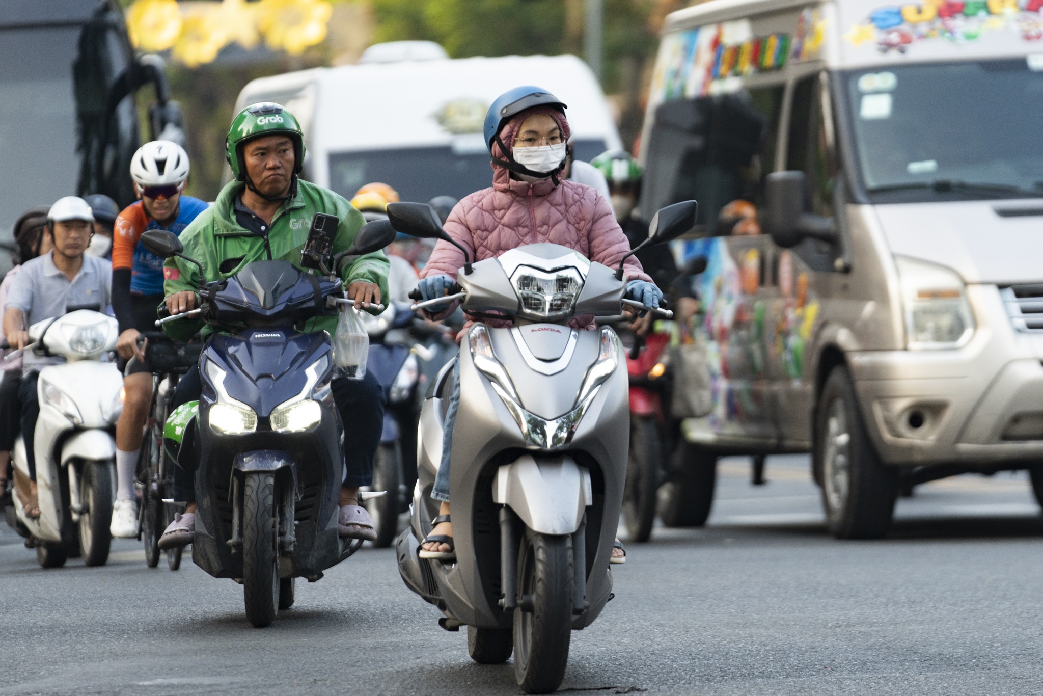 Từ phường Dĩ An, Trung Nam (áo trắng) dậy từ 5h sáng chạy xe vào trung tâm TP.HCM. "Xem dự báo thấy trời lạnh nên tôi đi liền. Lạnh buốt vậy mới đã, khỏi tốn tiền lên Đà Lạt", anh cười nói. Trung Nam và nhóm bạn khoác áo len, áo nỉ, mua xôi xéo và cà phê sữa đá - combo quen thuộc mỗi lần hẹn nhau "lên Sài Gòn".
