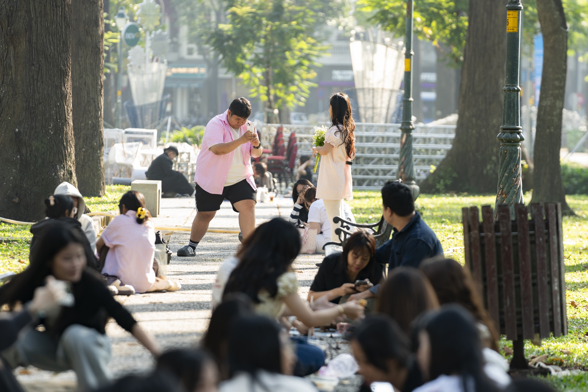 Đến khoảng 8h30, khu vực công viên 30/4 (TP.HCM) vẫn tấp nập bạn trẻ ghé uống cà phê, chụp ảnh. Cái se lạnh buổi sớm dần tan, nhường chỗ cho nắng lên cao, để những chiếc áo len, sweater dày được cởi bỏ, thay bằng áo phông ngắn tay quen thuộc.