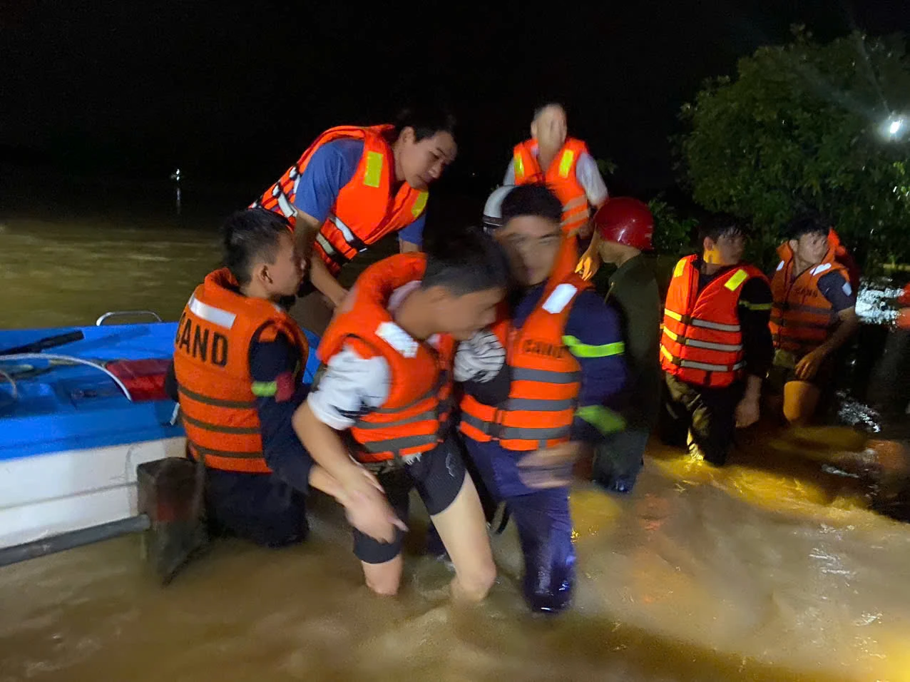 Lực lượng chức năng đưa những người dân ở xã Hiếu Giang bị mắc kẹt giữa dòng nước lũ trên sông Hiếu vào khu vực an toàn ngay trong đêm - Ảnh: CAQT