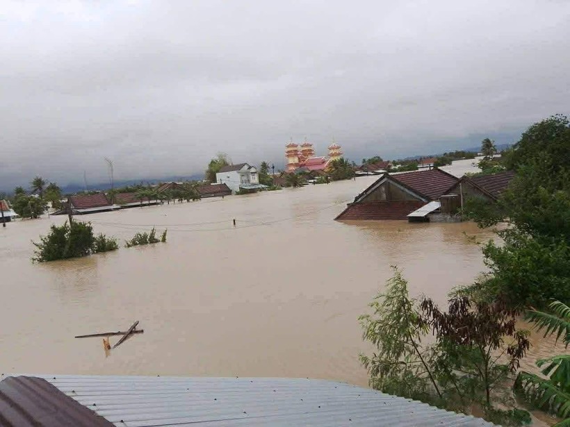 Nước ngập gần đến mái nhà dân ở Quy Nhơn, Đắk Lắk. Ảnh: Long Nhật.