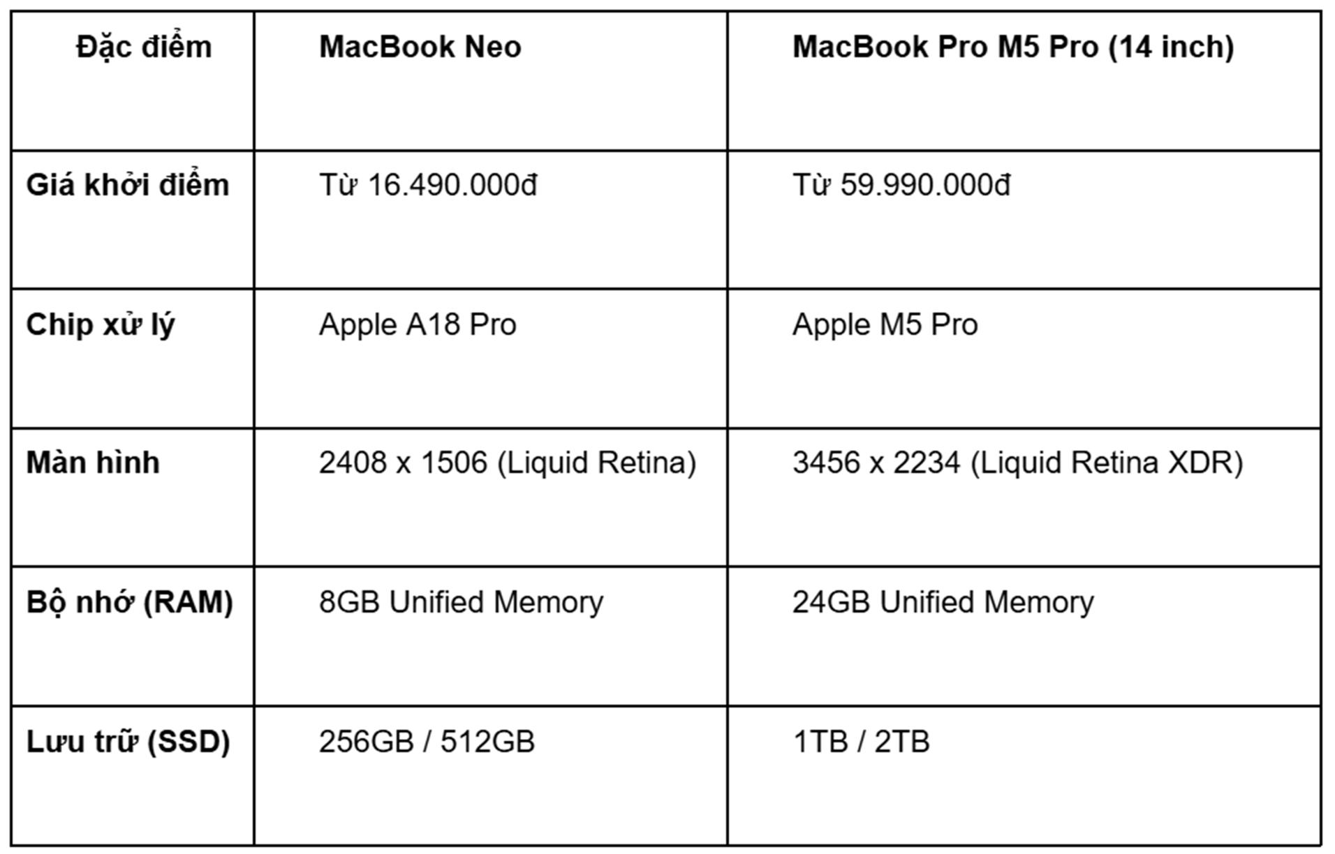 Khoảng cách giữa hai dòng máy thể hiện rõ qua thông số kỹ thuật và mức giá. MacBook Neo hướng đến trải nghiệm cơ bản với cấu hình đủ dùng, trong khi dòng Pro tập trung vào hiệu suất tối đa.