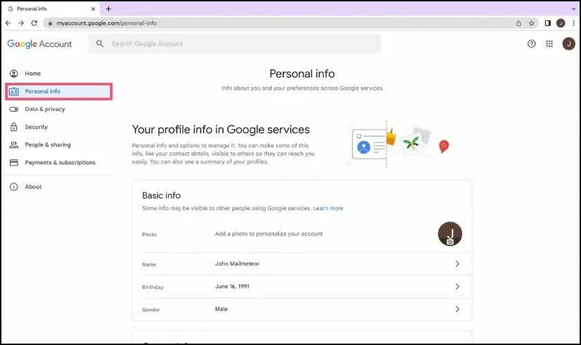 Tại giao diện quản lý, chọn Thông tin cá nhân (Personal info) ở menu bên trái. Khu vực này chứa các dữ liệu cơ bản như tên, ngày sinh, số điện thoại và email liên kết với tài khoản.