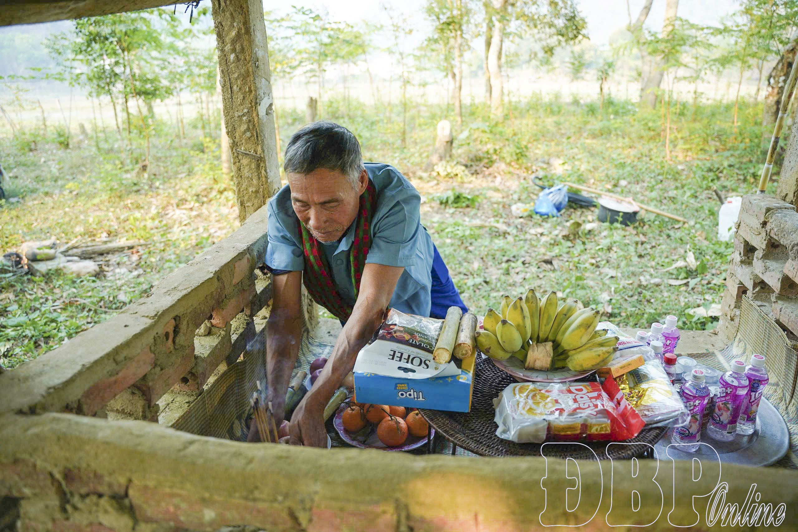 Ông Lò Văn Lún bày biện, chuẩn bị cho lễ cúng.