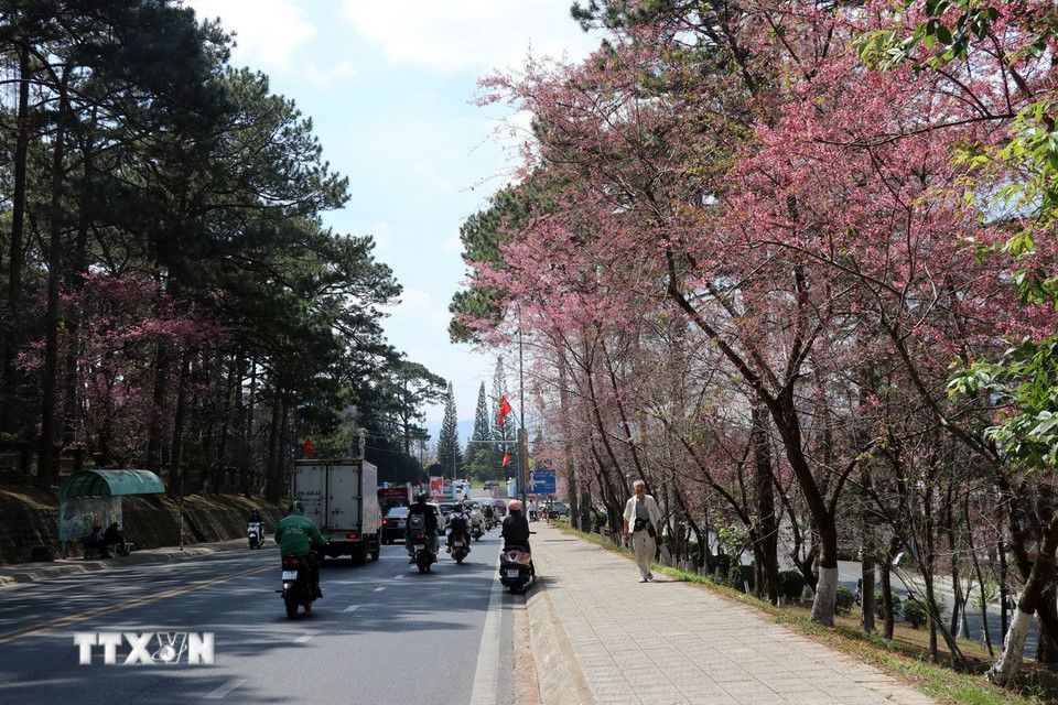 Đường Trần Hưng Đạo bung nở hàng Mai anh đào trước tết. (Ảnh: Chu Quốc Hùng/TTXVN)