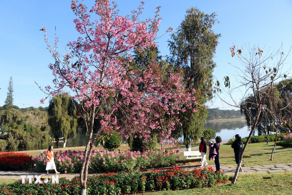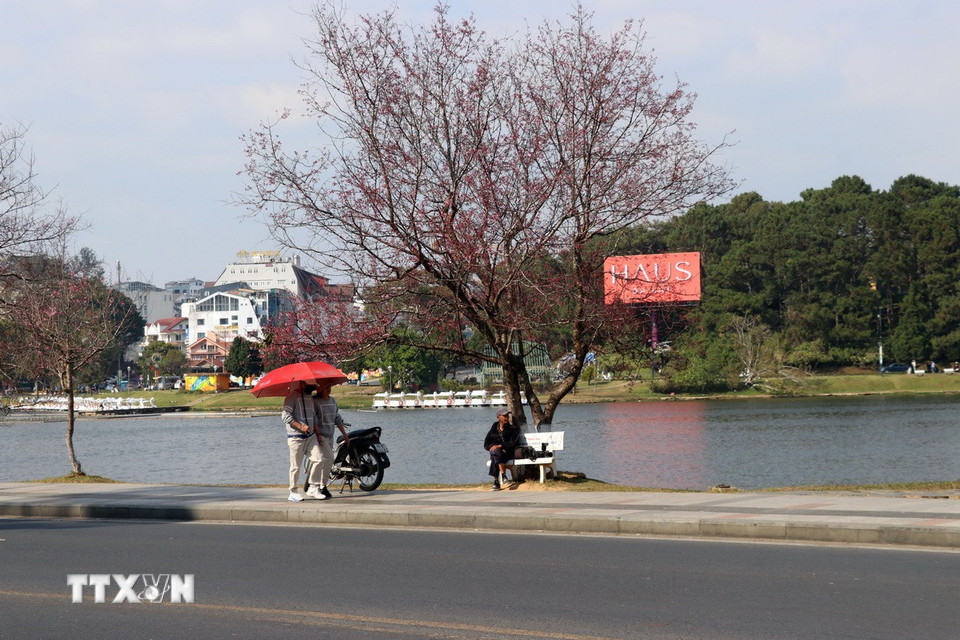Một trong những cây Mai anh đào đẹp nhất Đà Lạt ven hồ Xuân Hương được nhiều người chờ ngóng hoa bung nở. (Ảnh: Chu Quốc Hùng/TTXVN)
