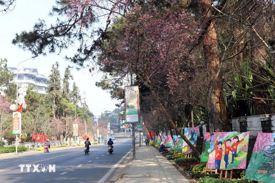 Tuyến đường Trần Hưng Đạo đã bung nở hàng cây Mai anh đào ven đường. (Ảnh: Chu Quốc Hùng/TTXVN)