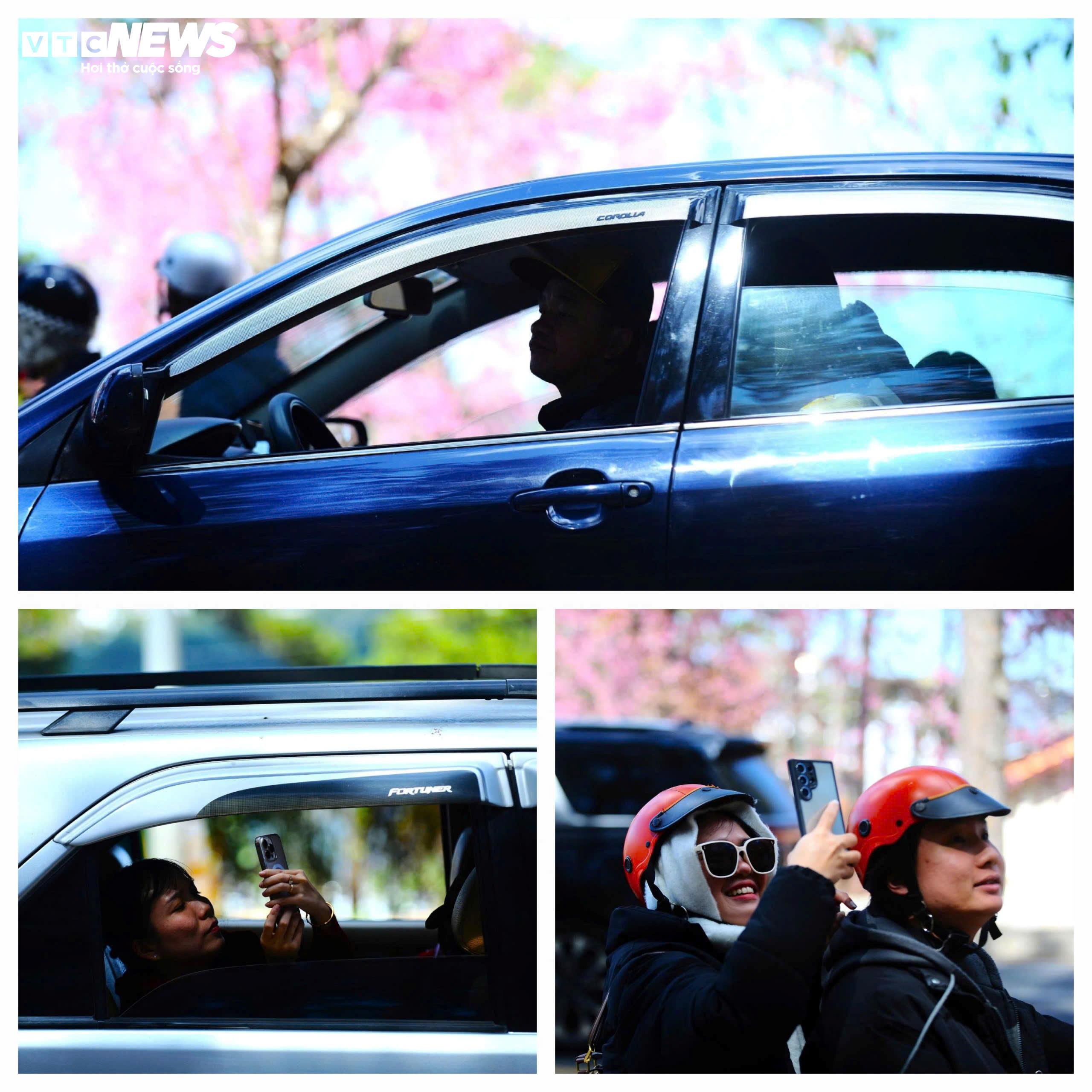 Từ sáng sớm, nhiều nhóm bạn trẻ, gia đình và các tour tham quan đã có mặt để ngắm hoa, chụp ảnh, ghi lại khoảnh khắc phố núi sương mù được "nhuộm hồng" ngay giữa trung tâm. Dọc tuyến đường Trần Hưng Đạo, hai hàng mai anh đào nở dày, tán cây phủ hồng tạo phông nền nổi bật bên những biệt thự cổ. Dòng người tấp nập hòa mình vào không gian thơ mộng để ngắm hoa và check-in dưới những chùm hoa rực rỡ.