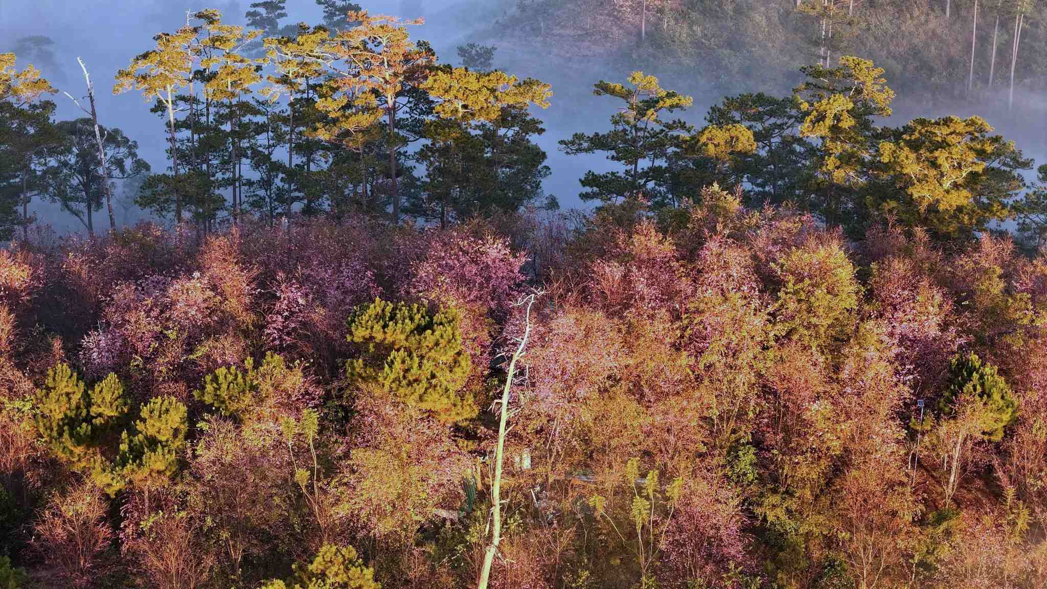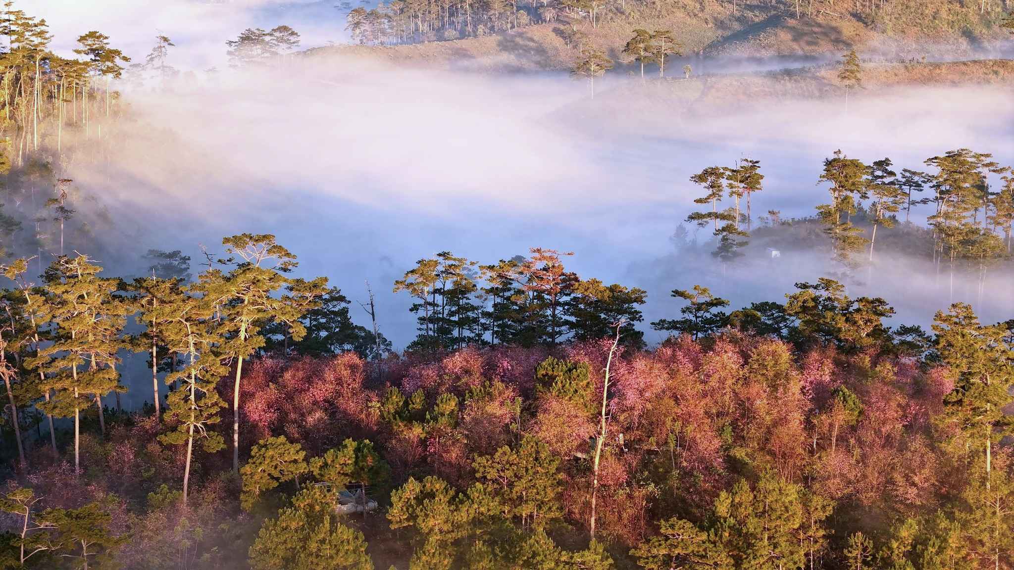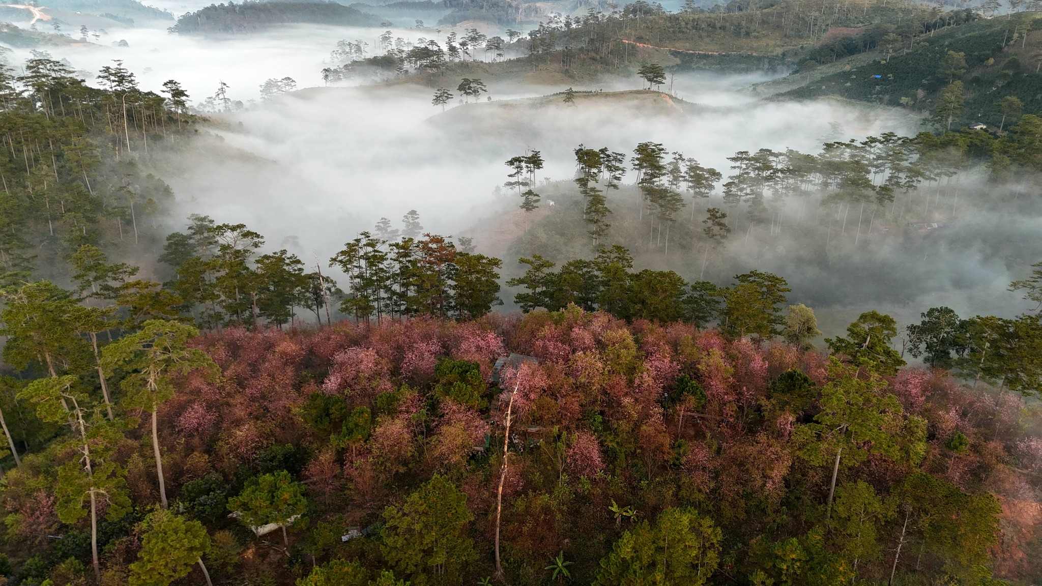 Tại đồi K’Long K’Lanh, những cây mai anh đào mọc xen giữa đồi cỏ, triền dốc và rừng thông, tạo nên bức tranh thiên nhiên hài hòa với gam hồng phấn nổi bật giữa nền xanh của núi rừng. Ảnh: Bảo Ân
