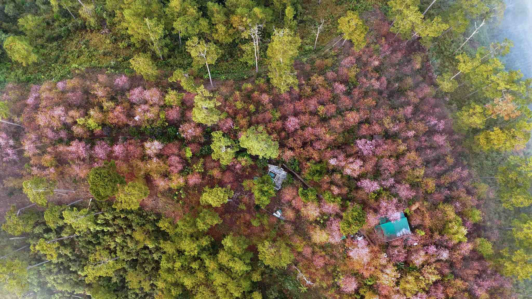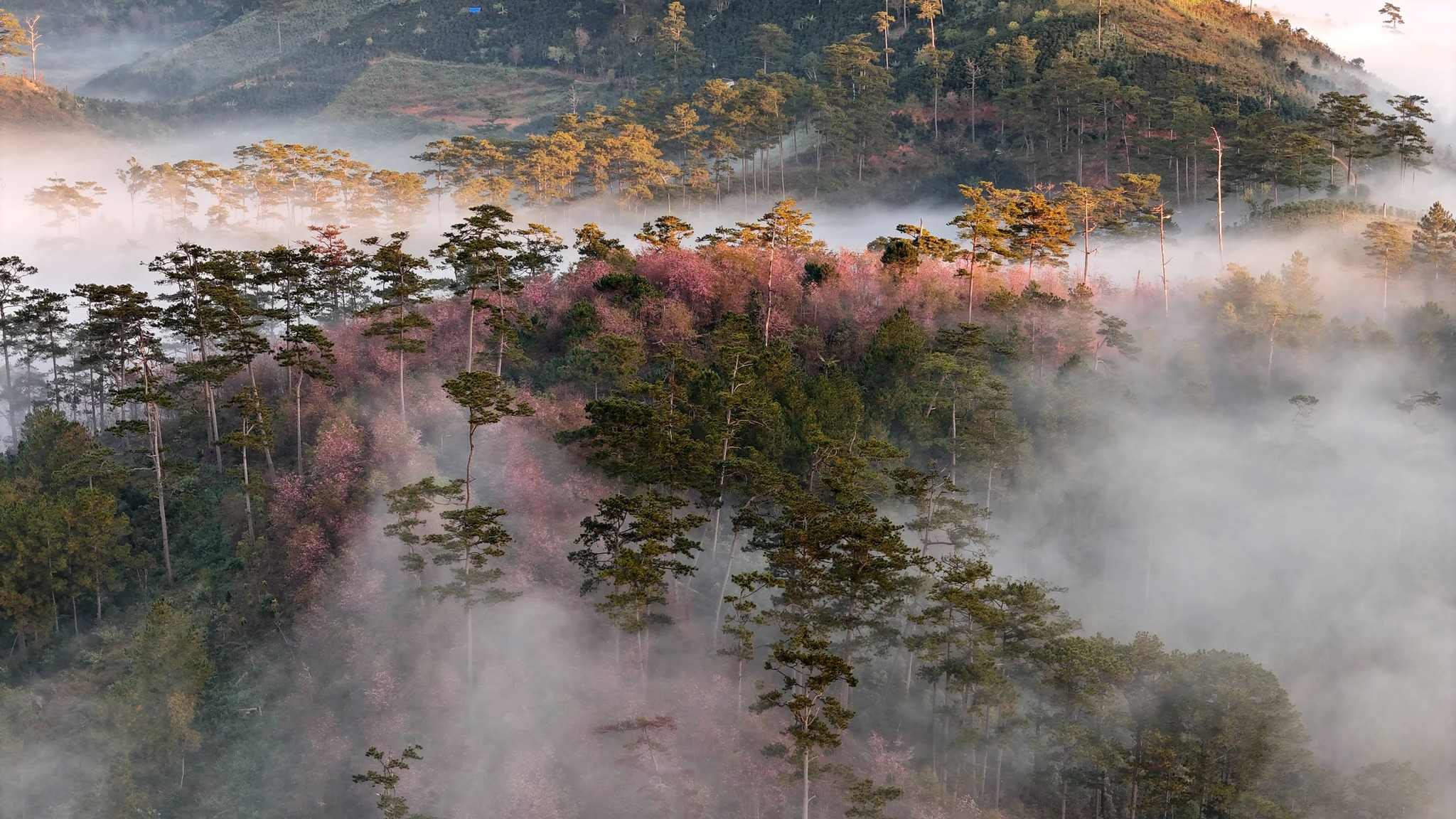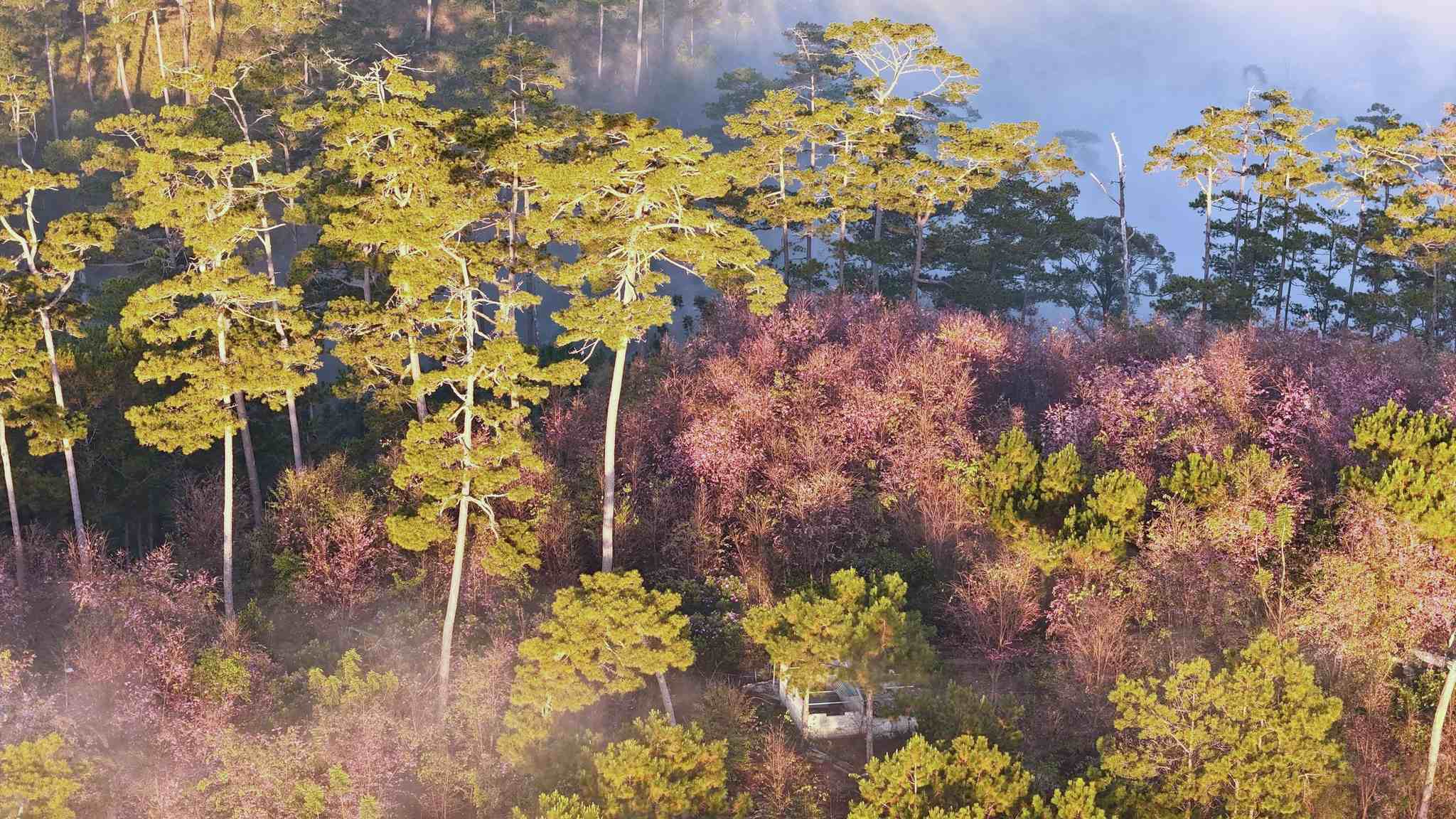 Tại đồi K’Long K’Lanh, những cây mai anh đào mọc xen giữa đồi cỏ, triền dốc và rừng thông, tạo nên bức tranh thiên nhiên hài hòa với gam hồng phấn nổi bật giữa nền xanh của núi rừng. Ảnh: Bảo Ân
