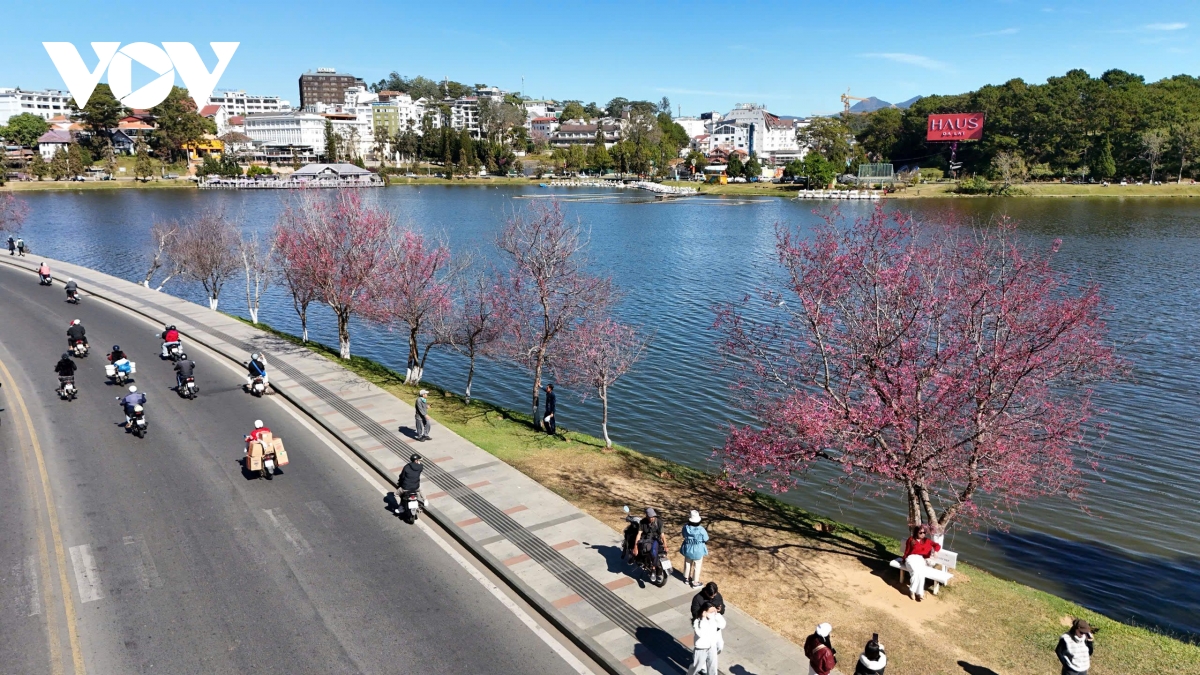 Mai anh đào nở rộ ven hồ Xuân Hương, tạo điểm nhấn cảnh quan giữa trung tâm Đà Lạt, nơi người dân và du khách dạo bộ, ngắm cảnh đầu xuân.