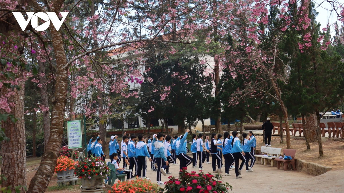 Học sinh tập thể dục dưới tán mai anh đào trong khuôn viên trường học tại Đà Lạt, tạo nên hình ảnh sinh hoạt đời thường, trong trẻo giữa sắc xuân phố núi.