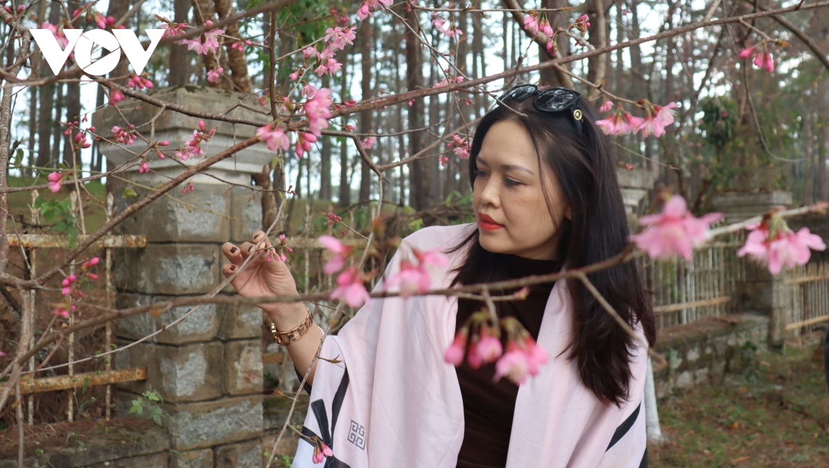 Du khách nhẹ tay nâng cành mai anh đào, cảm nhận vẻ đẹp dịu dàng của sắc hoa trong không gian rừng thông Đà Lạt.