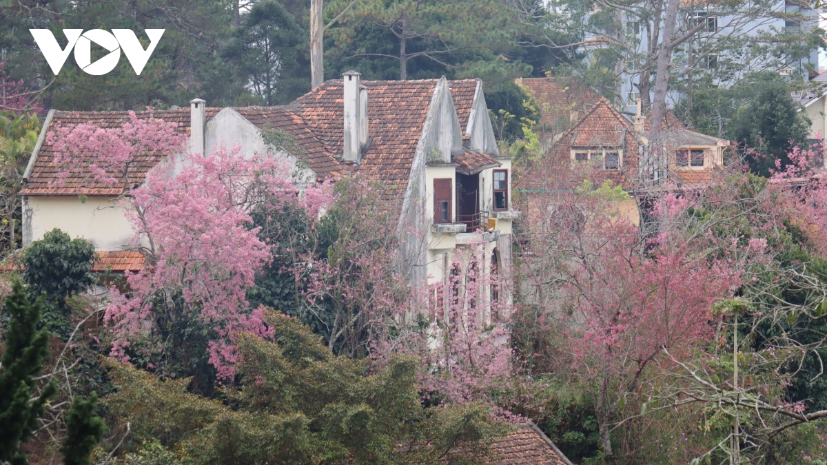 Mai anh đào nở xen giữa các khu biệt thự, nhà ở mang kiến trúc đặc trưng Đà Lạt, làm nổi bật vẻ trầm mặc, lãng mạn của đô thị cao nguyên.