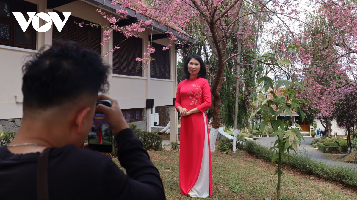 Du khách trong trang phục rực rỡ tạo dáng chụp ảnh dưới tán mai anh đào, góp phần làm không khí du lịch đầu xuân thêm nhộn nhịp.