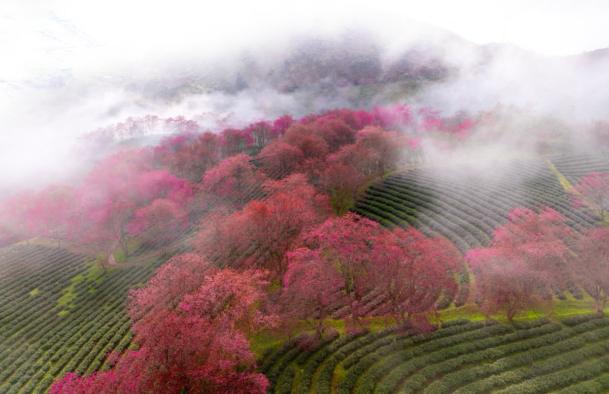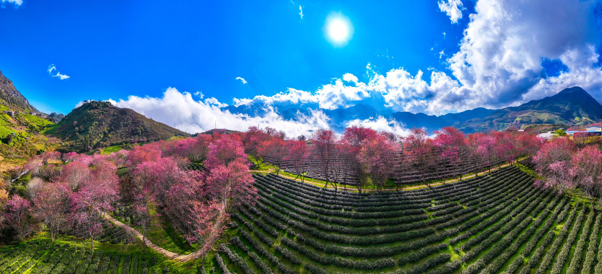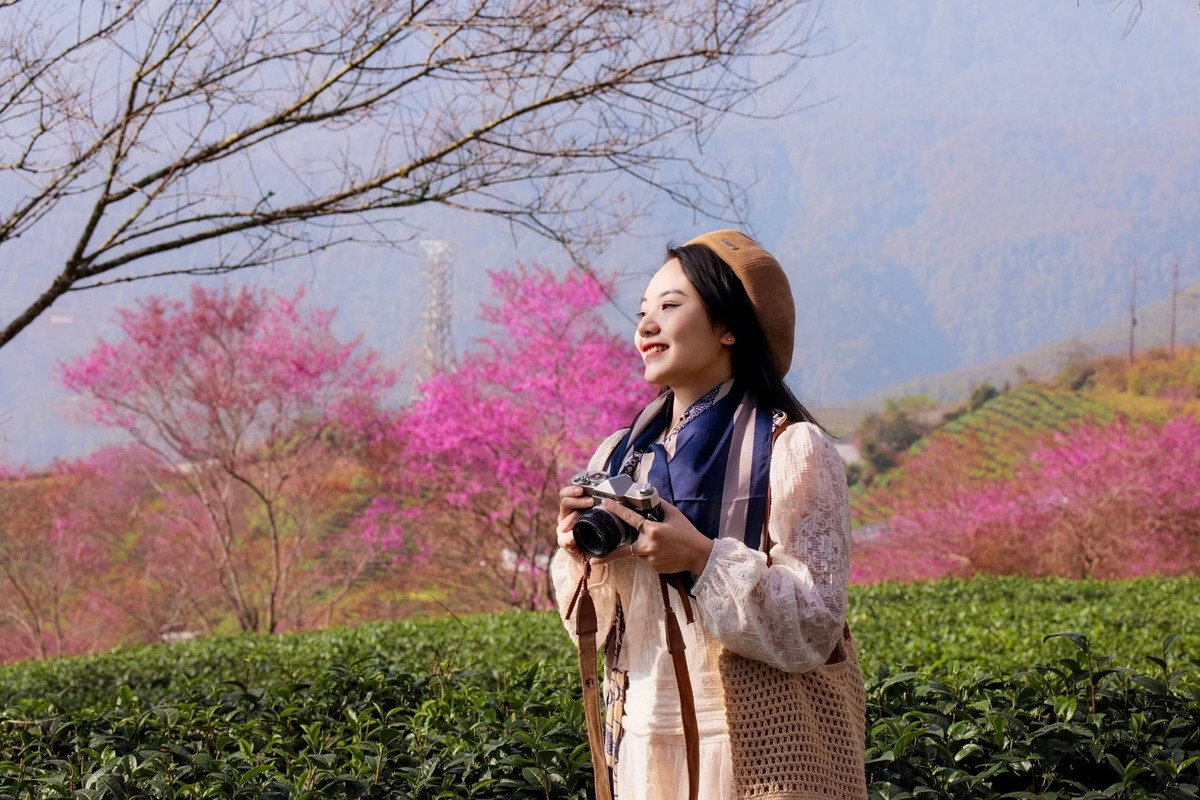 Trong số các điểm ngắm hoa, đồi chè Ô Long được xem là tọa độ lý tưởng. Những luống chè xanh mướt uốn lượn theo triền đồi, phía trên là mai anh đào nở hồng, phía xa là dãy Hoàng Liên Sơn ẩn hiện trong sương. Chỉ cần đứng ở một góc cao, du khách đã có thể thu vào tầm mắt toàn bộ khung cảnh đặc trưng của Sa Pa mùa đông.