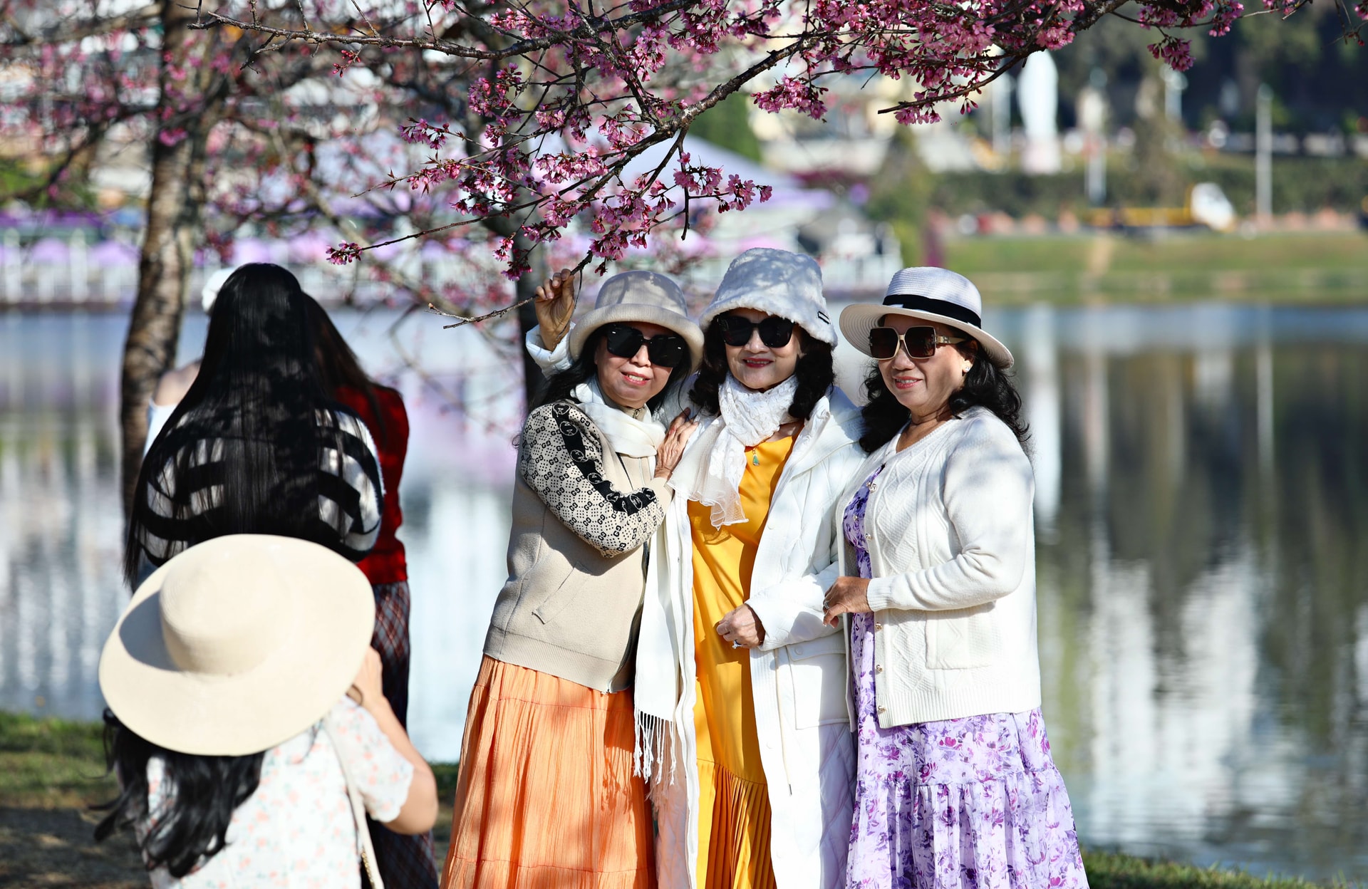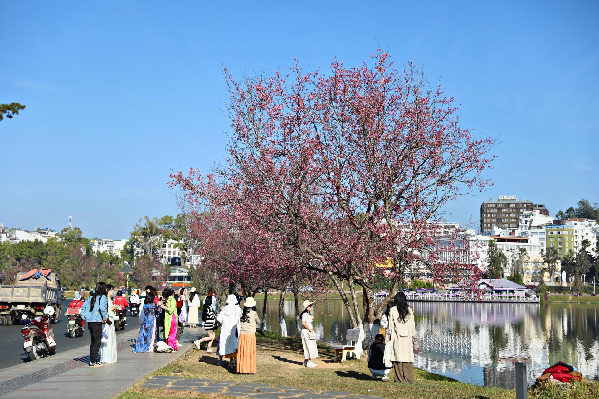 Dãy mai anh đào bắt đầu nở dọc hồ Xuân Hương thu hút nhiều du khách tới chụp hình từ sáng sớm tới chiều muộn