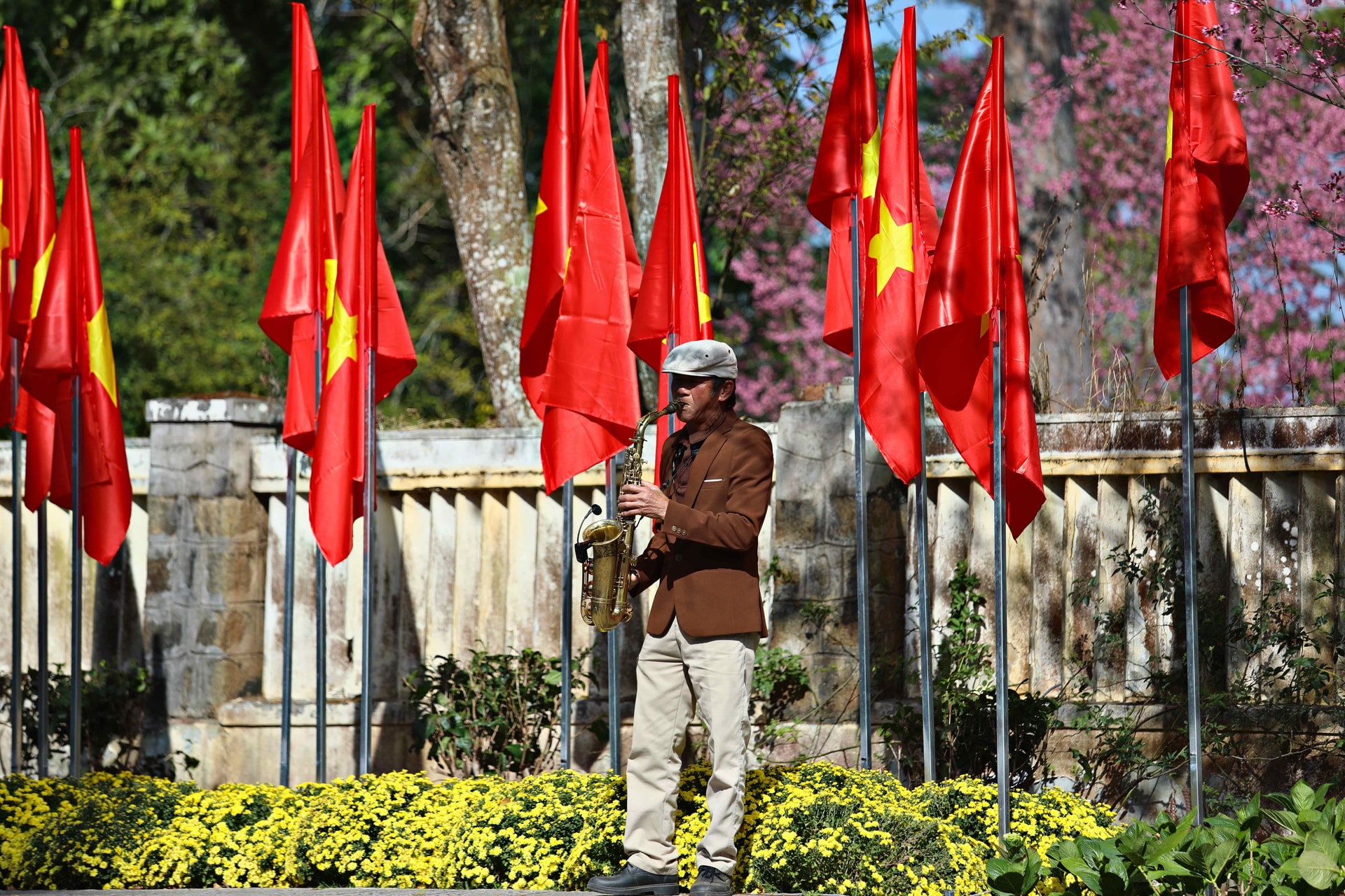 Nhạc công biểu diễn giai điệu cuốn hút dưới tán mai anh đào nở rộ trên đường Trần Hưng Đạo thu hút nhiều du khách