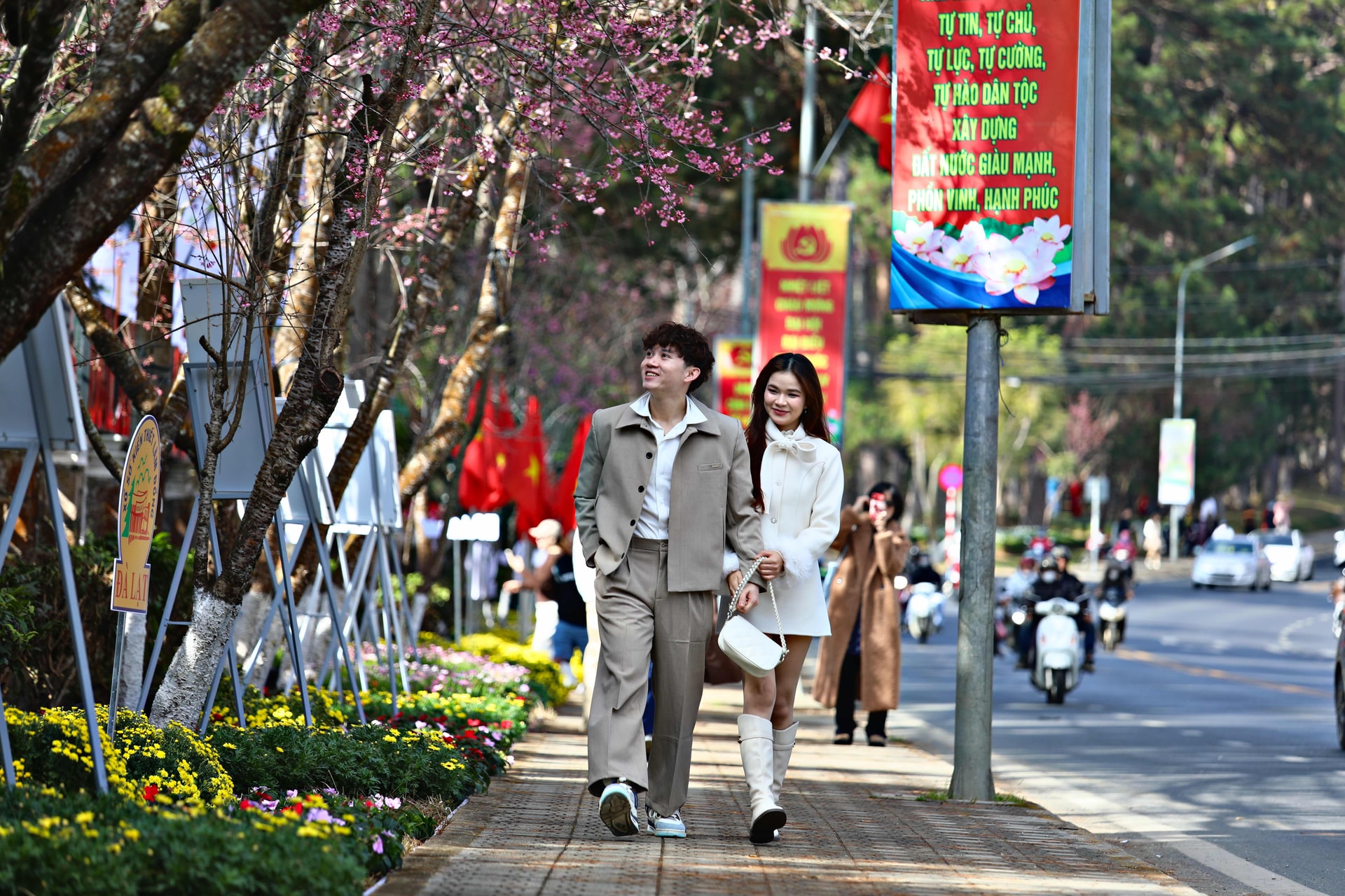 Du khách chậm rãi dạo bước, tận hưởng vẻ đẹp dịu dàng của cao nguyên mùa xuân trên đường Hùng Vương, Trần Hưng Đạo
