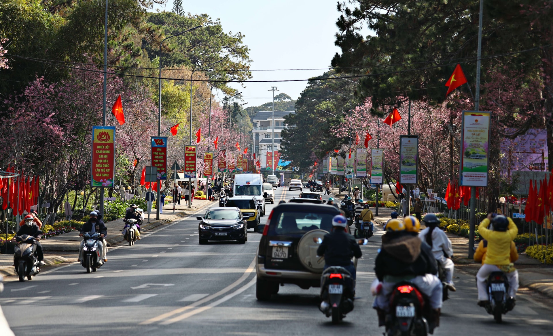 Tuyến đường Hùng Vương dài 1,7km bừng lên sắc hồng sáng 29/1