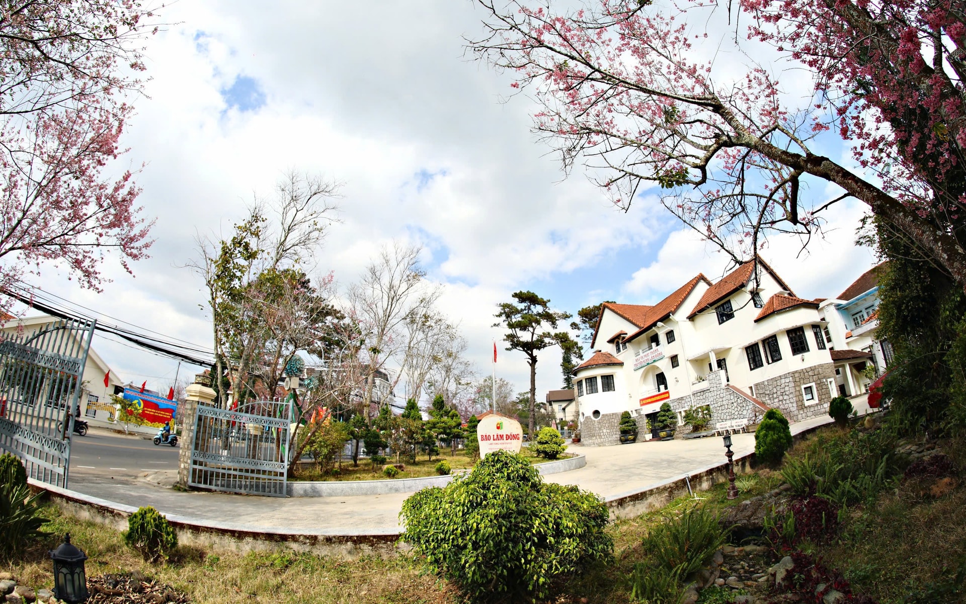 Một góc khuôn viên Báo và Phát thanh Truyền hình Lâm Đồng nhuộm màu sắc hồng hoa Mai anh đào
